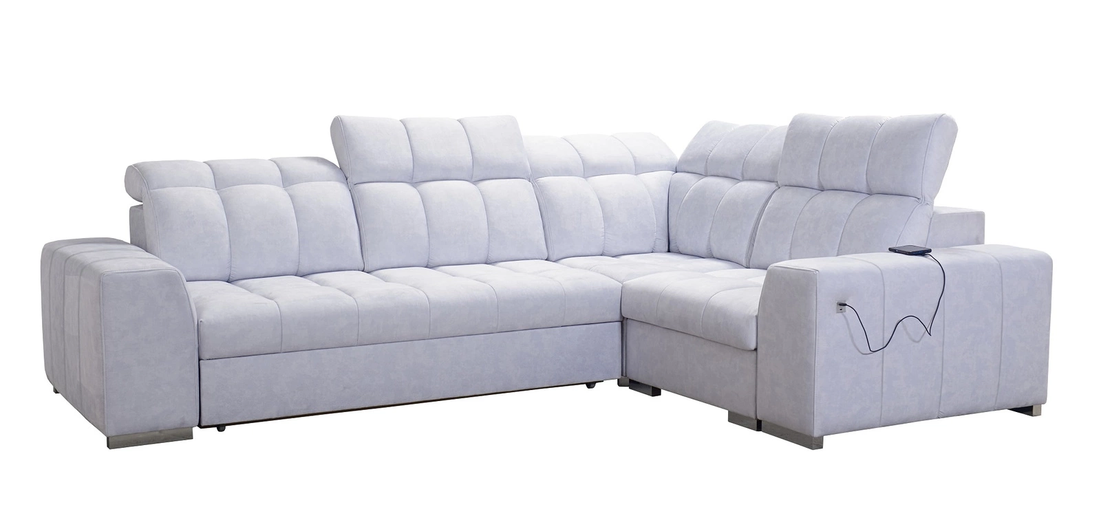 Dodatki tego mebla, które docenią wszyscy użytkownicy to pojemnik na pościel, funkcja spania oraz gniazdo ładowania USB w boczku narożnika.