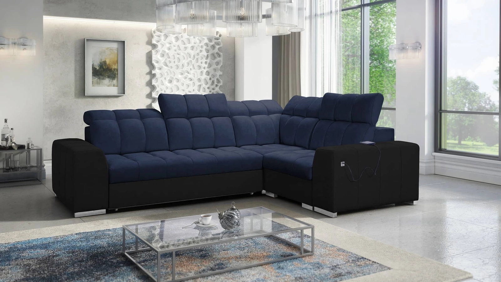 Narożnik Luigi II w kolorze granatowym / czarny z regulowanymi zagłówkami to zachwycający mebel z gwarancją najwyższego komfortu i funkcjonalności!