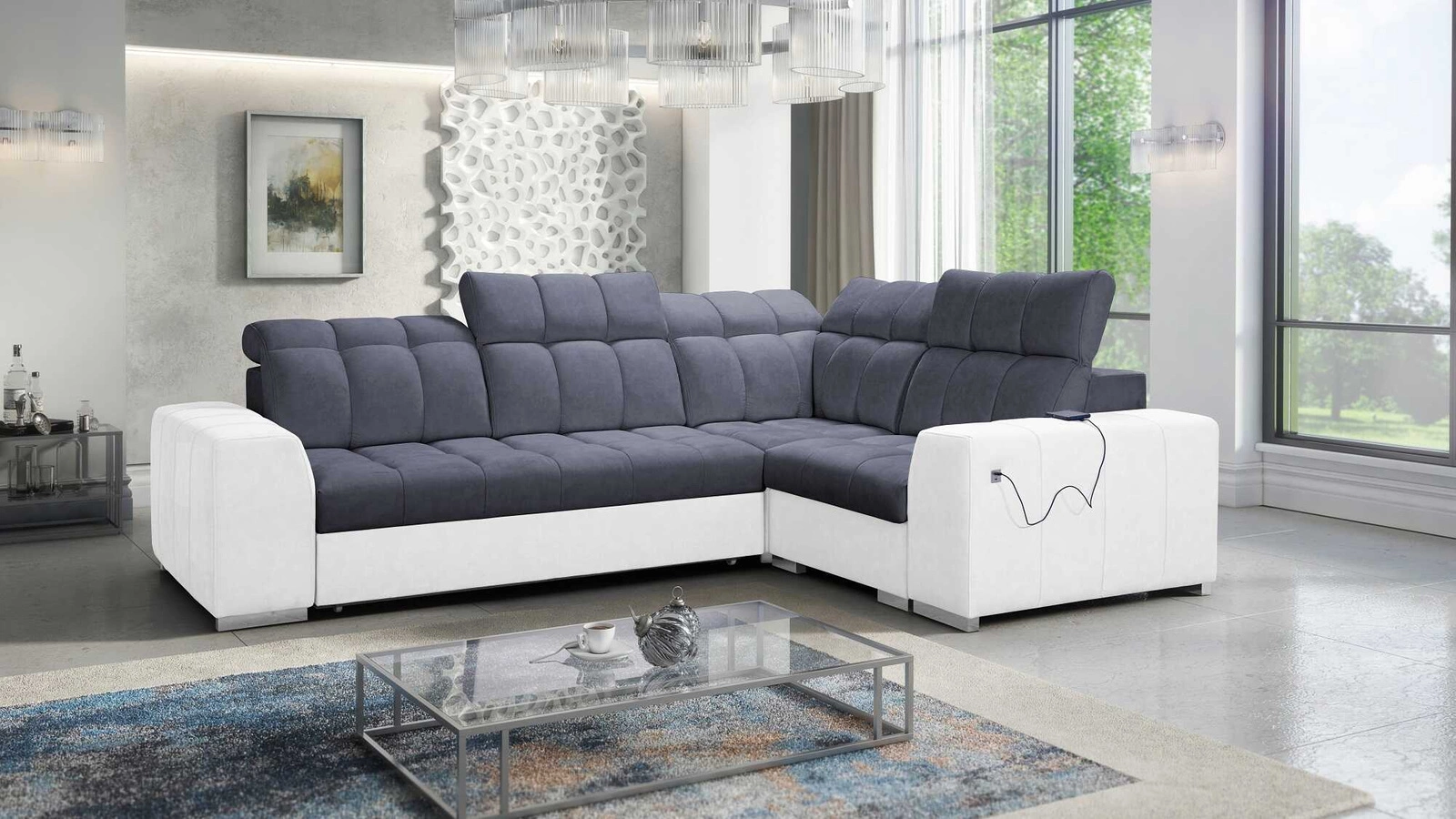 Dodatki tego mebla, które docenią wszyscy użytkownicy to pojemnik na pościel, funkcja spania oraz gniazdo ładowania USB w boczku narożnika.