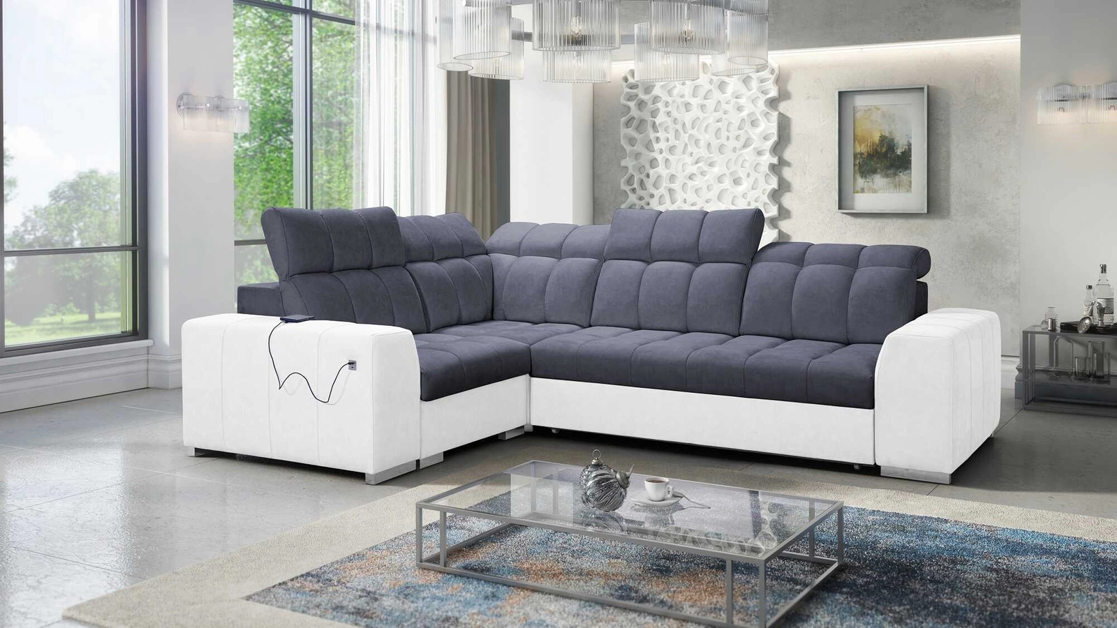 Dodatki tego mebla, które docenią wszyscy użytkownicy to pojemnik na pościel, funkcja spania oraz gniazdo ładowania USB w boczku narożnika.