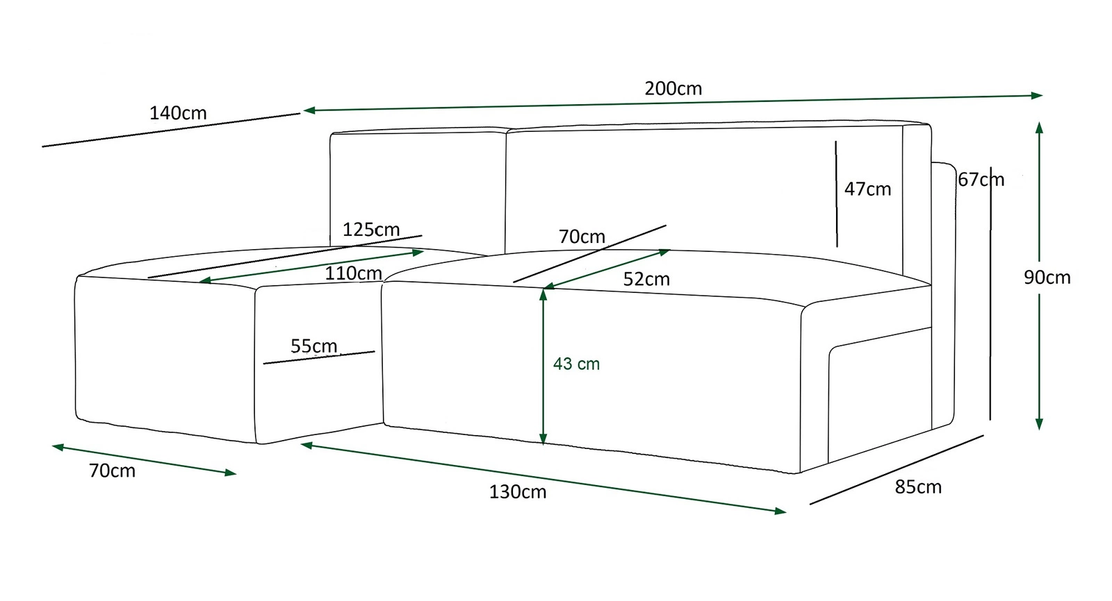 Dzięki swoim optymalnym wymiarom oraz szerokiej funkcjonalności narożnik z funkcją spania świetnie sprawdzi się jako narożnik do pokoju dziennego lub jako narożnik rozkładany do pokoju nastolatka. Szerokość narożnika 200 cm, wysokość maksymalna 90 cm oraz głębokość 140 cm. Powierzchnia spania narożnika wynosi 125x200 cm. Wysokość siedziska mebla to 43 cm, a wysokość oparcia wynosi 47 cm. Sprężyny faliste oraz pianka HR30 to materiał, z którego wykonane zostało siedzisko narożnika. Oparcie poduchy daje gwarancję wygodnego wypoczynku po długim dniu, które docenisz Ty, a także goście, którzy zasiądą na tym wyjątkowym narożniku!