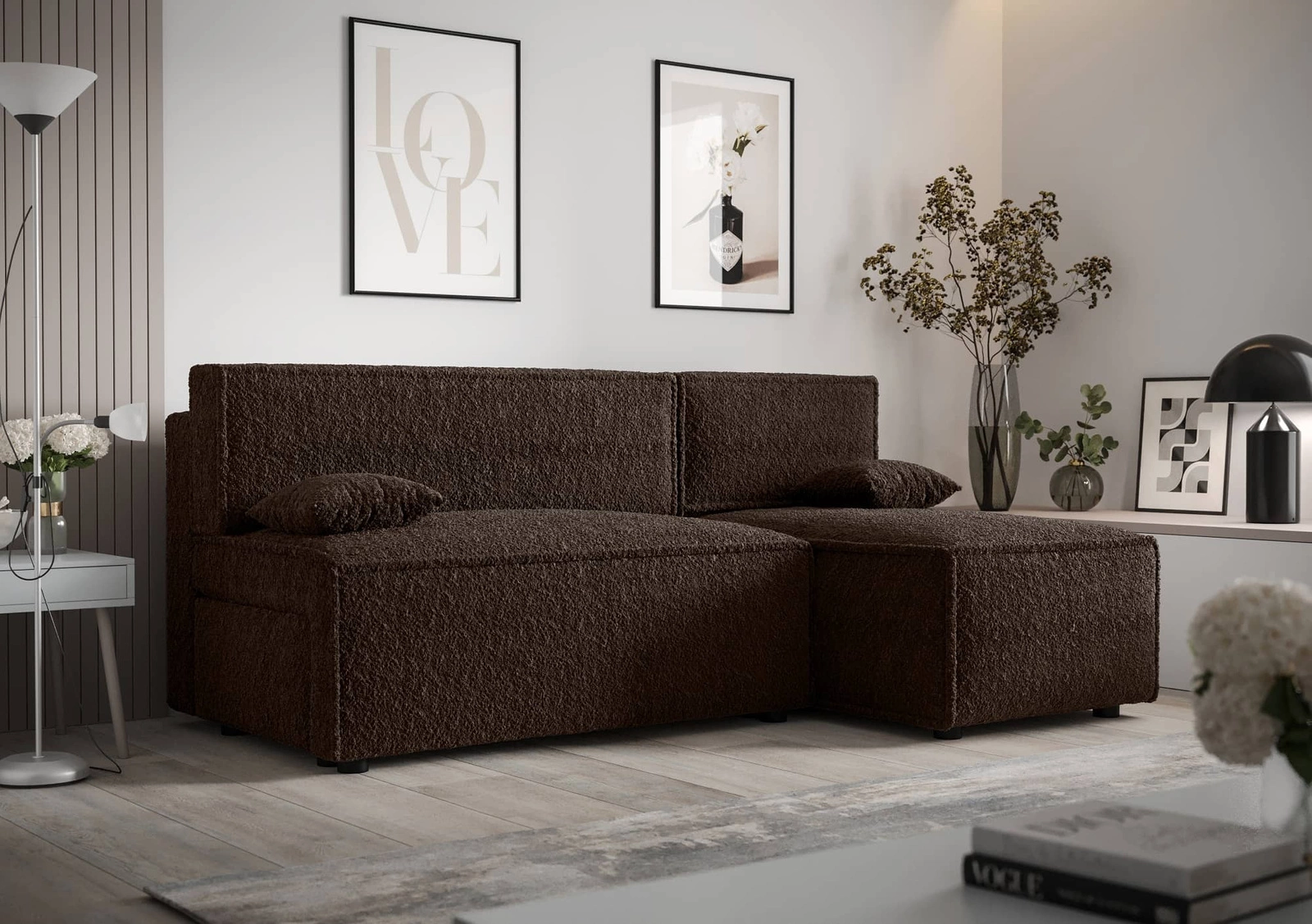 Narożnik z funkcją spania Brandon brązowy prawostronny miękka tkanina o charakterystycznej pętelkowej powierzchni pojemnik na pościel