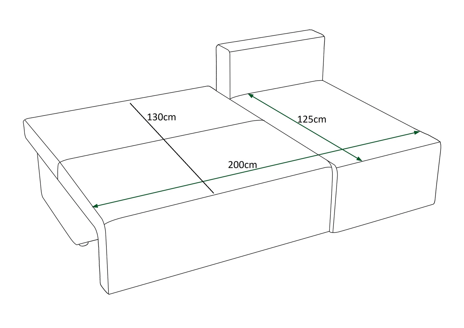 Dzięki swoim optymalnym wymiarom oraz szerokiej funkcjonalności narożnik z funkcją spania świetnie sprawdzi się jako narożnik do pokoju dziennego lub jako narożnik rozkładany do pokoju nastolatka. Szerokość narożnika 200 cm, wysokość maksymalna 90 cm oraz głębokość 140 cm. Powierzchnia spania narożnika wynosi 125x200 cm. Wysokość siedziska mebla to 43 cm, a wysokość oparcia wynosi 47 cm. Sprężyny faliste oraz pianka HR30 to materiał, z którego wykonane zostało siedzisko narożnika. Oparcie poduchy daje gwarancję wygodnego wypoczynku po długim dniu, które docenisz Ty, a także goście, którzy zasiądą na tym wyjątkowym narożniku!