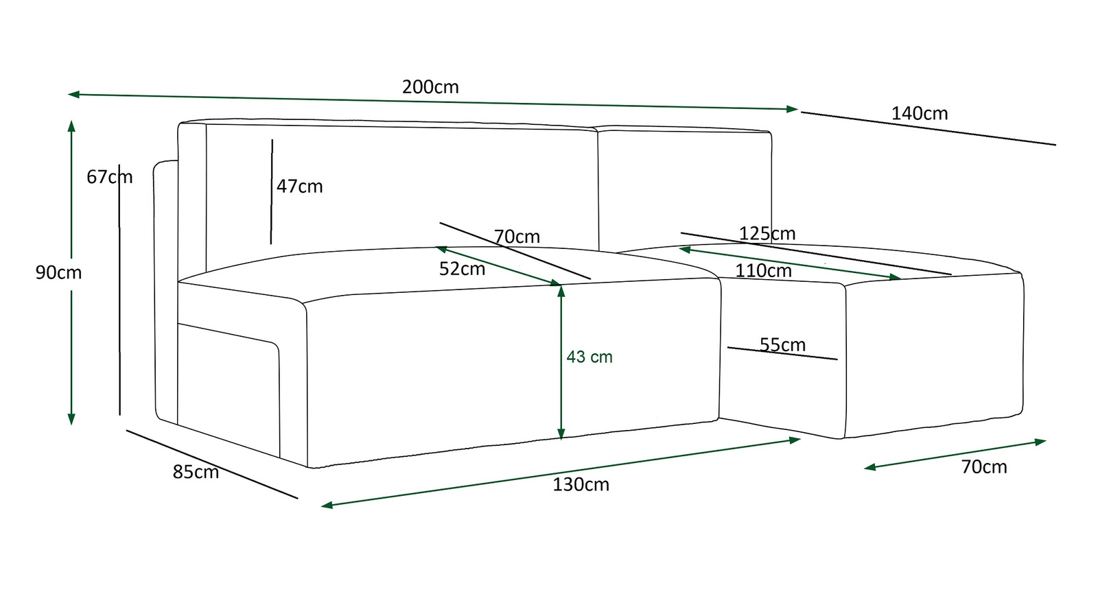Dzięki swoim optymalnym wymiarom oraz szerokiej funkcjonalności narożnik z funkcją spania świetnie sprawdzi się jako narożnik do pokoju dziennego lub jako narożnik rozkładany do pokoju nastolatka. Szerokość narożnika 200 cm, wysokość maksymalna 90 cm oraz głębokość 140 cm. Powierzchnia spania narożnika wynosi 125x200 cm. Wysokość siedziska mebla to 43 cm, a wysokość oparcia wynosi 47 cm. Sprężyny faliste oraz pianka HR30 to materiał, z którego wykonane zostało siedzisko narożnika. Oparcie poduchy daje gwarancję wygodnego wypoczynku po długim dniu, które docenisz Ty, a także goście, którzy zasiądą na tym wyjątkowym narożniku!