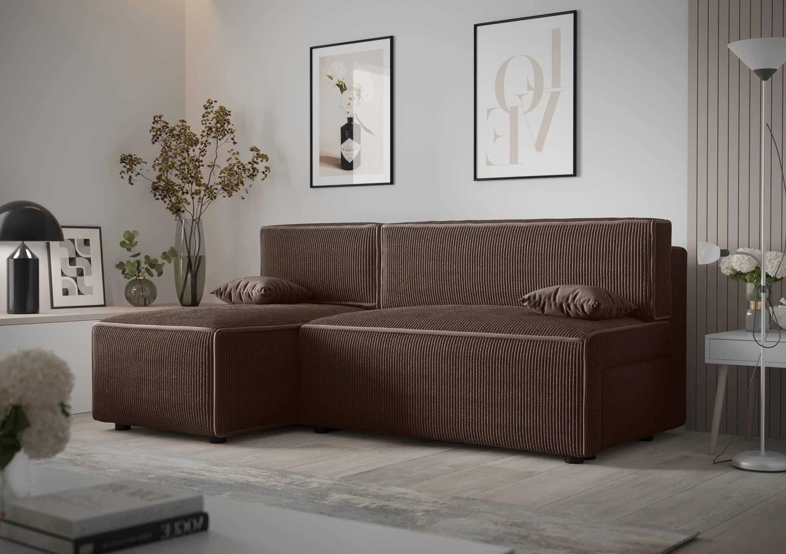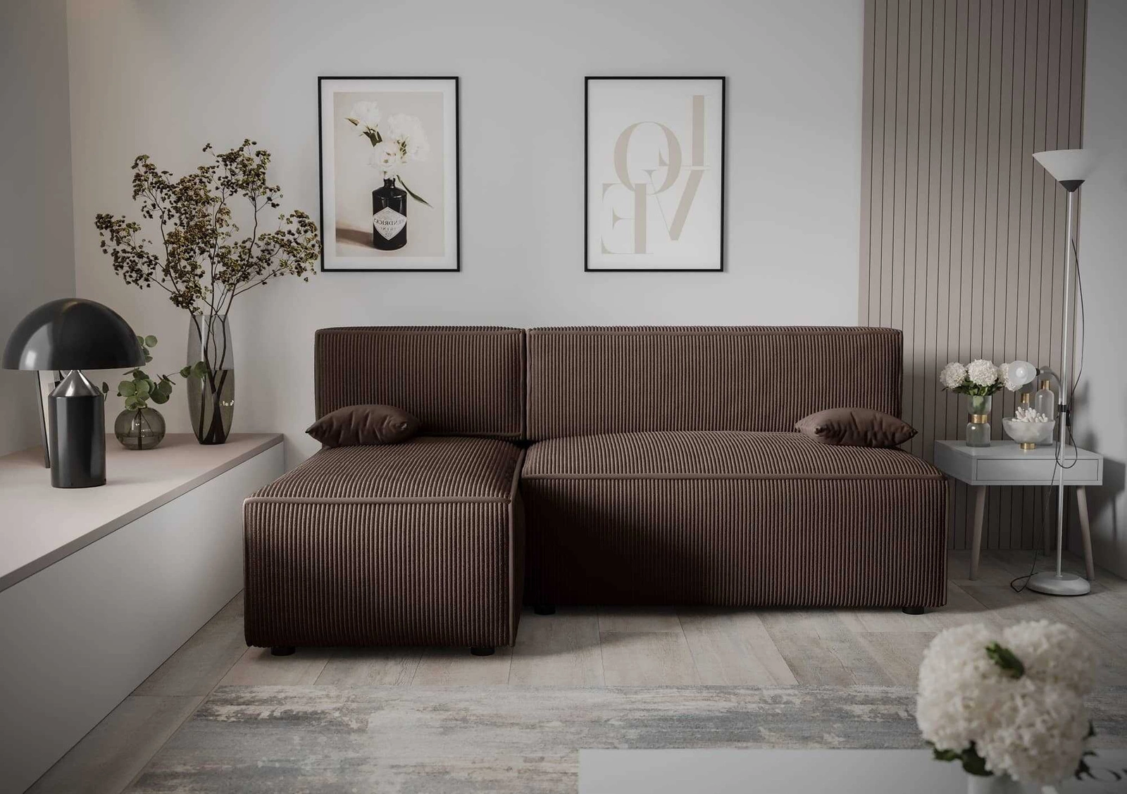 Narożnik z funkcją spania Brandon to prosty mebel o nowoczesnym designie, który idealnie wkomponuje się w każdą aranżację. Narożnik w całości pokryty został tkaniną typu welur Poso 06. Trójwymiarowa sztruksowa tkanina o wyrazistych i grubych prążkach nadaje szczególnego charakteru oraz nadaje kanapie wyjątkowej urody. Tkanina jest bardzo miękka, a przy tym mocna i wytrzymała. Tkanina obiciowa Poso jest odporna na ścieranie, a także łatwa do utrzymania w czystości. Dzięki temu narożnik rozkładany Brandon przez długi czas będzie wyglądał estetycznie i elegancko. Narożnik z funkcją spania codziennego wykonany został z wysokiej jakości materiałów, które charakteryzują się odpornością na wpływ czynników zewnętrznych takich jak obicia mebla oraz różnego typu uderzenia.