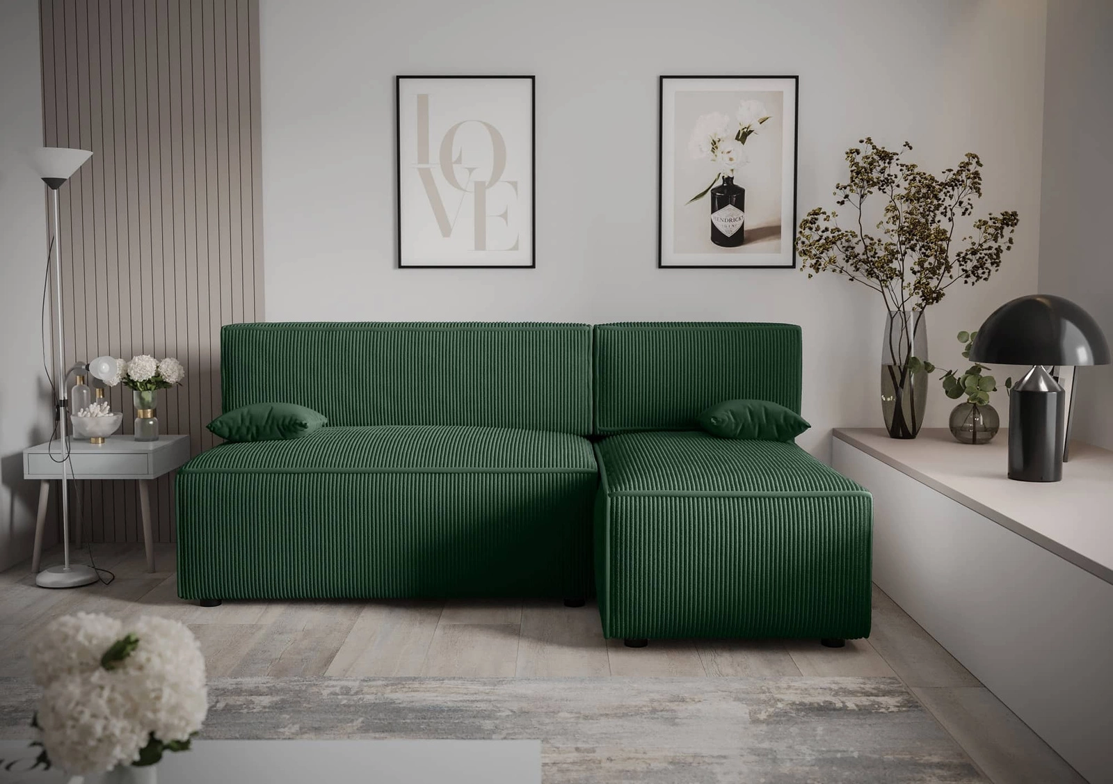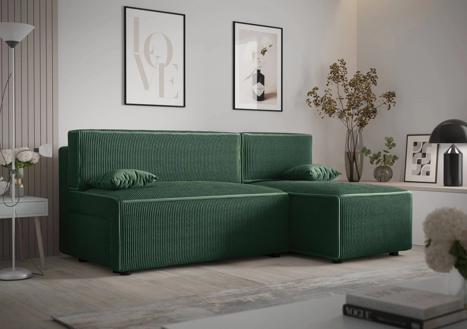 Narożnik z funkcją spania Brandon zielony prawostronny trójwymiarowa tkanina o wyrazistych prążkach pojemnik na pościel
