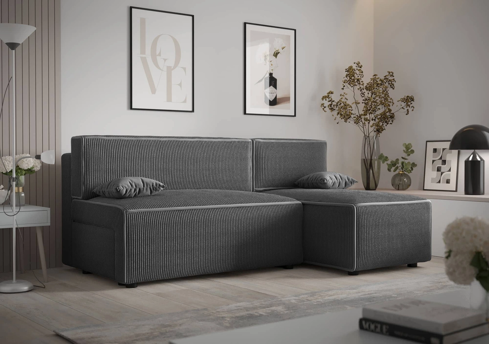 Narożnik z funkcją spania Brandon to prosty mebel o nowoczesnym designie, który idealnie wkomponuje się w każdą aranżację. Narożnik w całości pokryty został tkaniną typu welur Poso 60. Trójwymiarowa sztruksowa tkanina o wyrazistych i grubych prążkach nadaje szczególnego charakteru oraz nadaje kanapie wyjątkowej urody. Tkanina jest bardzo miękka, a przy tym mocna i wytrzymała. Tkanina obiciowa Poso jest odporna na ścieranie, a także łatwa do utrzymania w czystości. Dzięki temu narożnik rozkładany Brandon przez długi czas będzie wyglądał estetycznie i elegancko. Narożnik z funkcją spania codziennego wykonany został z wysokiej jakości materiałów, które charakteryzują się odpornością na wpływ czynników zewnętrznych takich jak obicia mebla oraz różnego typu uderzenia.