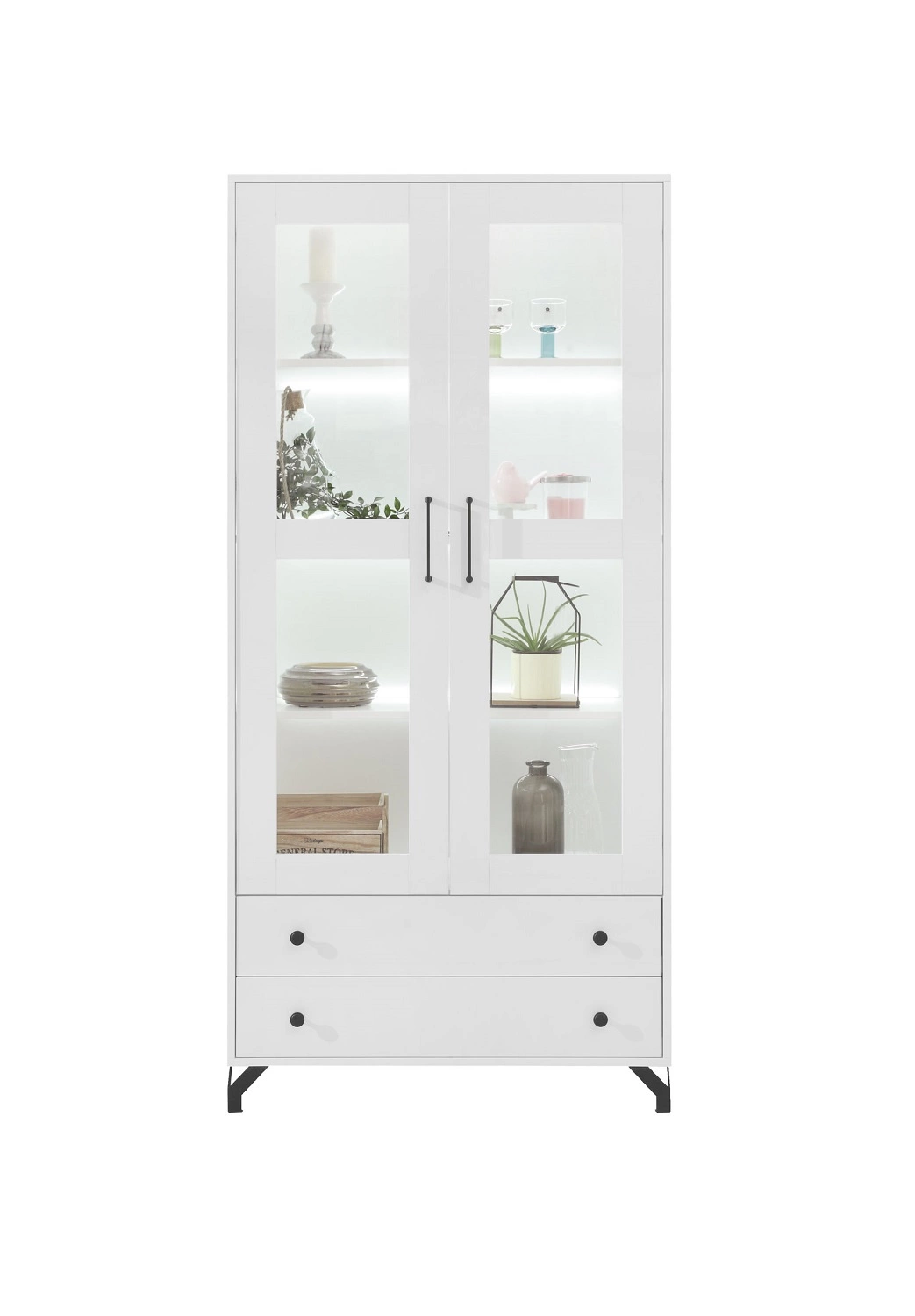 Witryna Skien 90 cm biała połysk elegancka stylistyka prosta forma mebla wzbogacona o stylowe metalowe elementy czarne nogi elementy z bezpiecznego szkła