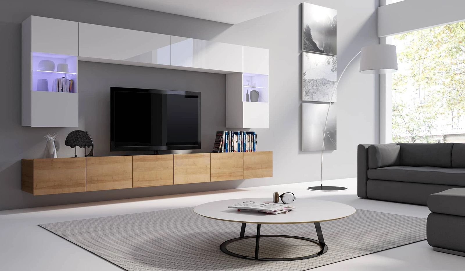 Meblościanka Apulia w kolorze biały / dąb złoty to nowoczesny design mebla, który stanie się stylowym wykończeniem wnętrza.