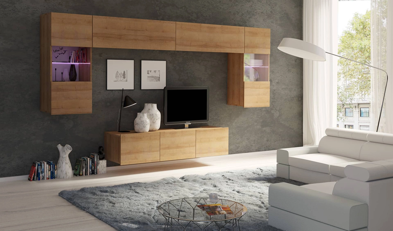 Meblościanka Apulia w kolorze dąb złoty to nowoczesny design mebla, który stanie się stylowym wykończeniem wnętrza.