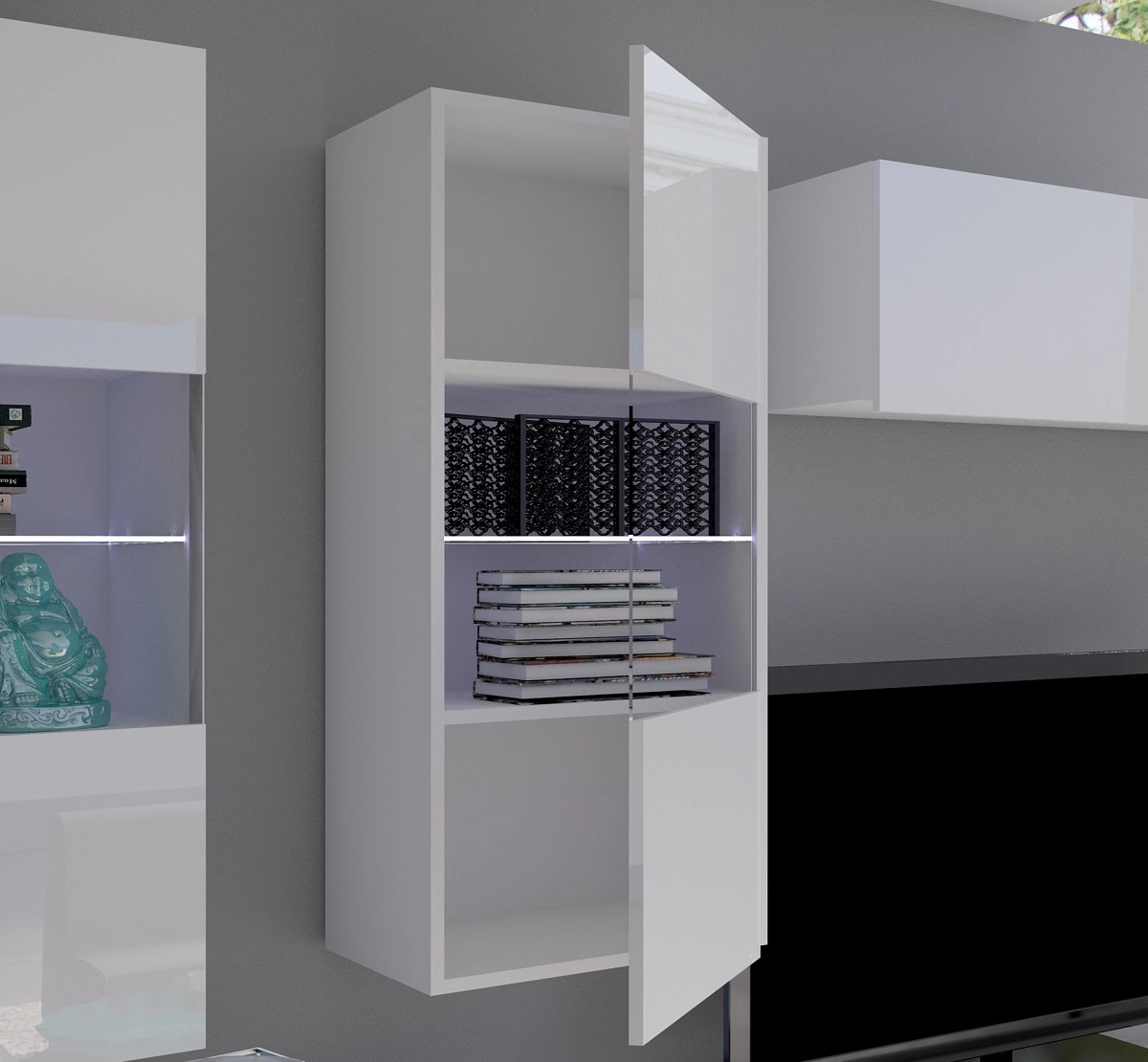 Meblościanka Apulia w kolorze białym to nowoczesny design mebla, który stanie się stylowym wykończeniem wnętrza.