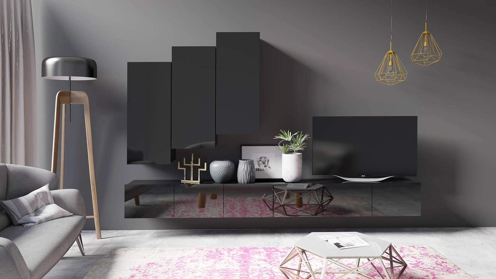 Meblościanka wykonana została z wysokiej jakości płyty laminowanej, która charakteryzuje się odpornością na wpływ czynników zewnętrznych takich jak obicia, uderzenia i niefortunne zadrapania. Meble Apulia gwarantują bezproblemowe korzystanie oraz trwałość całej meblościanki przez wiele lat użytkowania. Kultowa czerń brył świetnie łączy się z innymi kolorami, dzięki czemu meble Apulia świetnie sprawdzą się jako meblościanka do salonu lub meblościanka do pokoju dziennego.