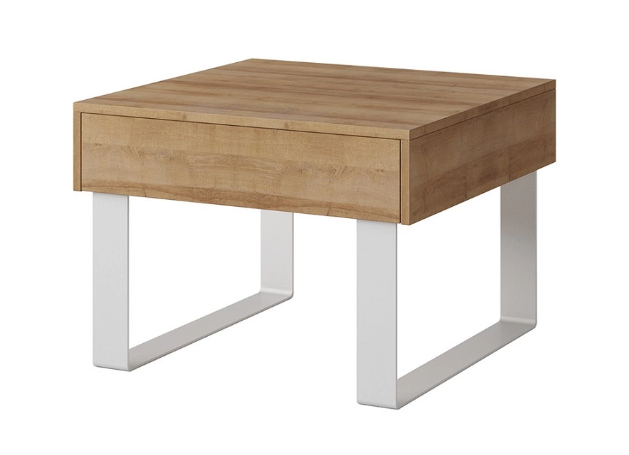 Pojemna szafka RTV pomieści wszystkie akcesoria oraz sprzęty. Subtelnie wysunięte ponad linię blatu fronty pełnią także funkcję uchwytu. Dodatkowym atutem szafki RTV jest możliwość wybrania sposobu ustawienia. Szafka RTV może być zawieszona na ścianie. Dzięki znajdującym się w zestawie nóżkom wykonanym z tworzywa bardzo szybko szafka RTV może stać się meblem stojącym. Konstrukcja stolika kawowego z szufladą została wsparta na metalowych nogach w kolorze chromu.