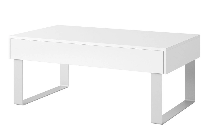 Przeszklone fronty komody oraz witryny pozwolą wyeksponować dodatki stanowiące dekorację salonu. Pojemne szafki RTV pomieszczą wszystkie akcesoria oraz sprzęty. Subtelnie wysunięte ponad linię blatu fronty pełnią także funkcję uchwytu. Dodatkowym atutem szafki RTV jest możliwość wybrania sposobu ustawienia. Szafka RTV może być zawieszona na ścianie. Dzięki znajdującym się w zestawie nóżkom wykonanym z tworzywa bardzo szybko szafka RTV może stać się meblem stojącym. Konstrukcja stolika kawowego z szufladą została wsparta na metalowych nogach w kolorze chromu.