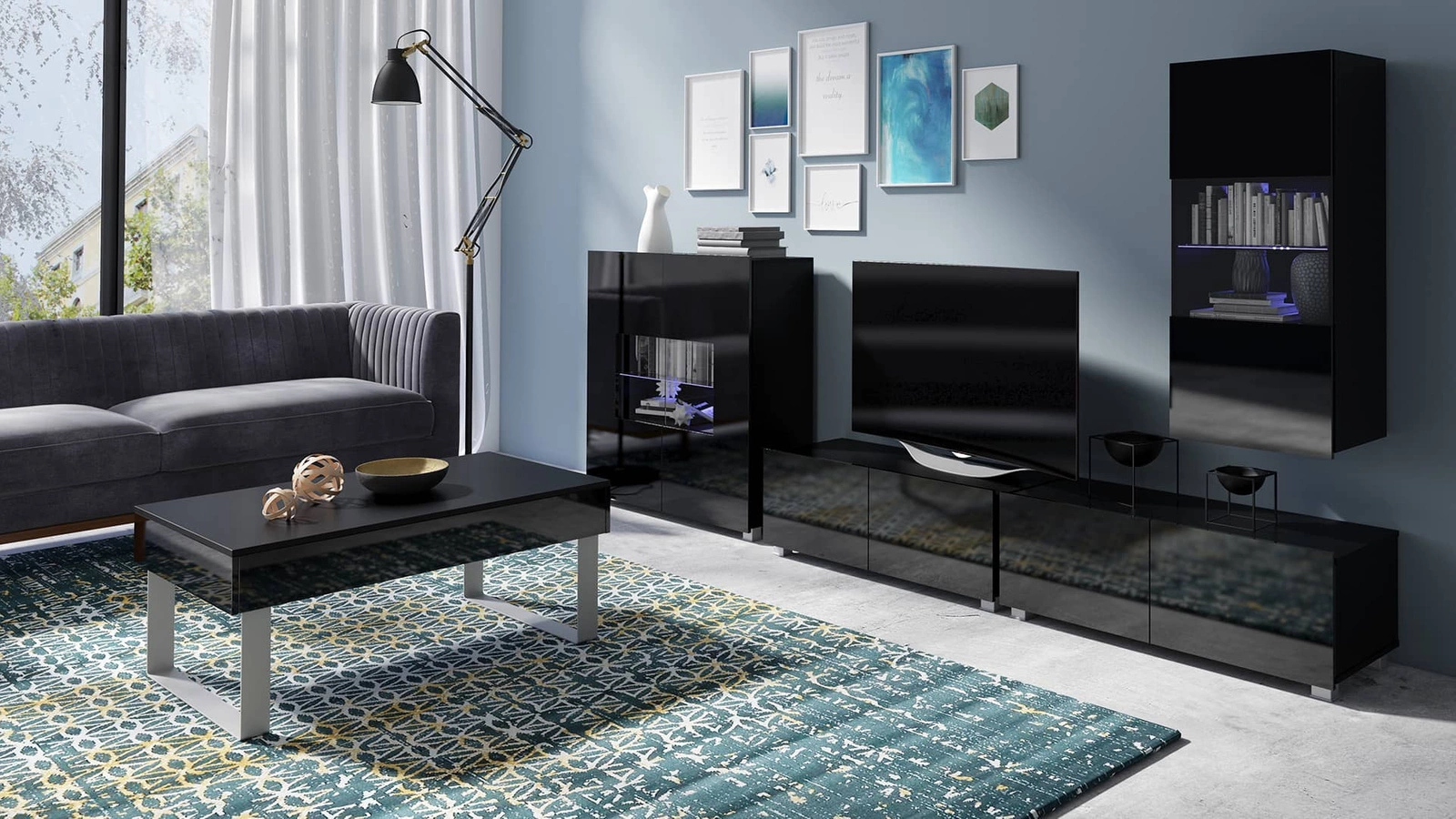 Zestaw mebli Apulia XXII czarny połysk wyjątkowo stylowa meblościanka do salonu proste bryły wpisujące się w każde wnętrze