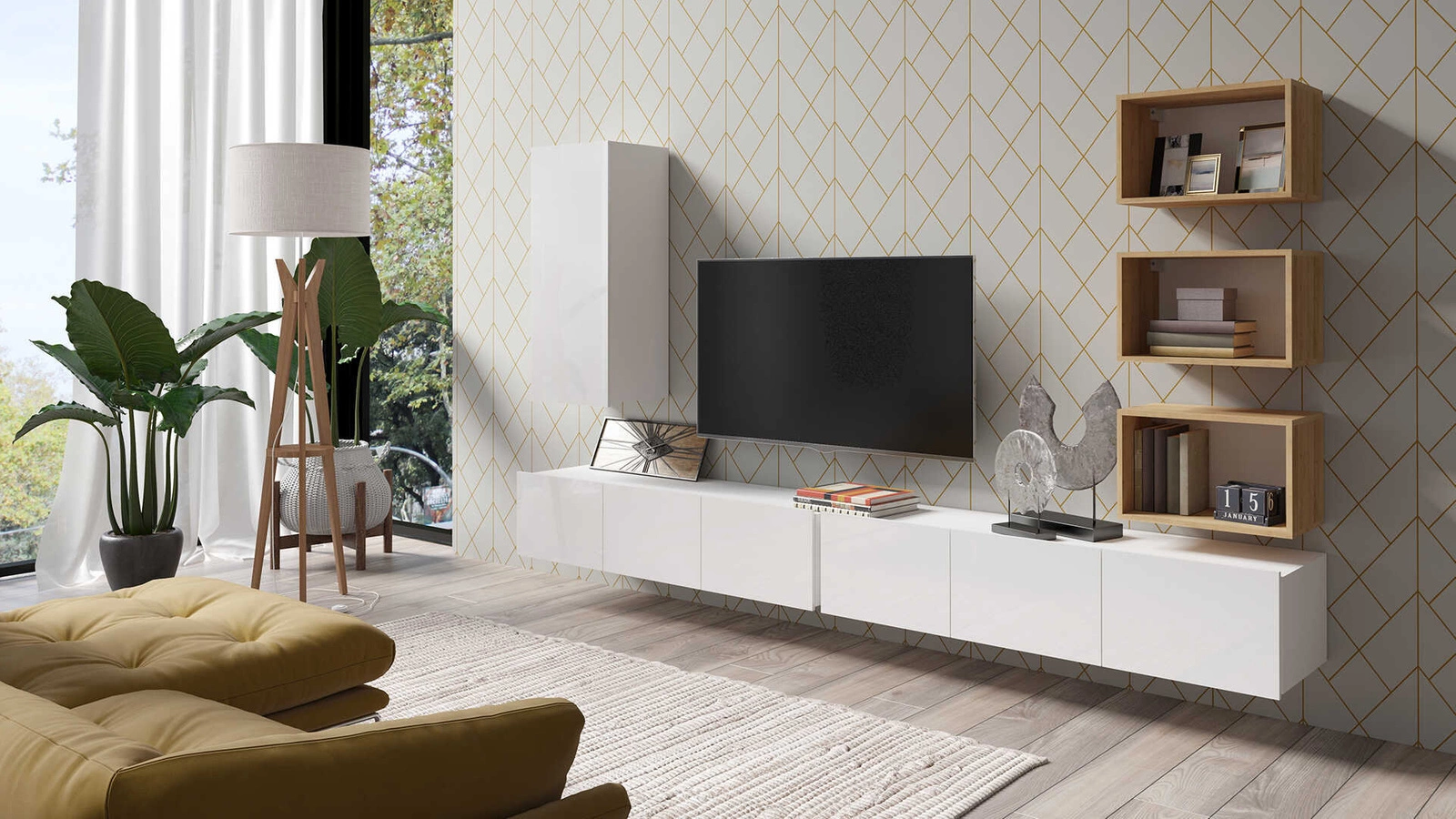Otwarte półki pozwolą subtelnie wyeksponować dodatki stanowiące dekorację salonu. Pojemne szafki RTV pomieszczą wszystkie akcesoria oraz sprzęty. Subtelnie wysunięte ponad linię blatu fronty pełnią także funkcję uchwytu. Dodatkowym atutem szafek RTV jest możliwość wybrania sposobu ustawienia. Szafka RTV może stać na podłodze. Dzięki znajdującym się w zestawie zawieszkom bardzo szybko szafka RTV może stać się meblem wiszącym.