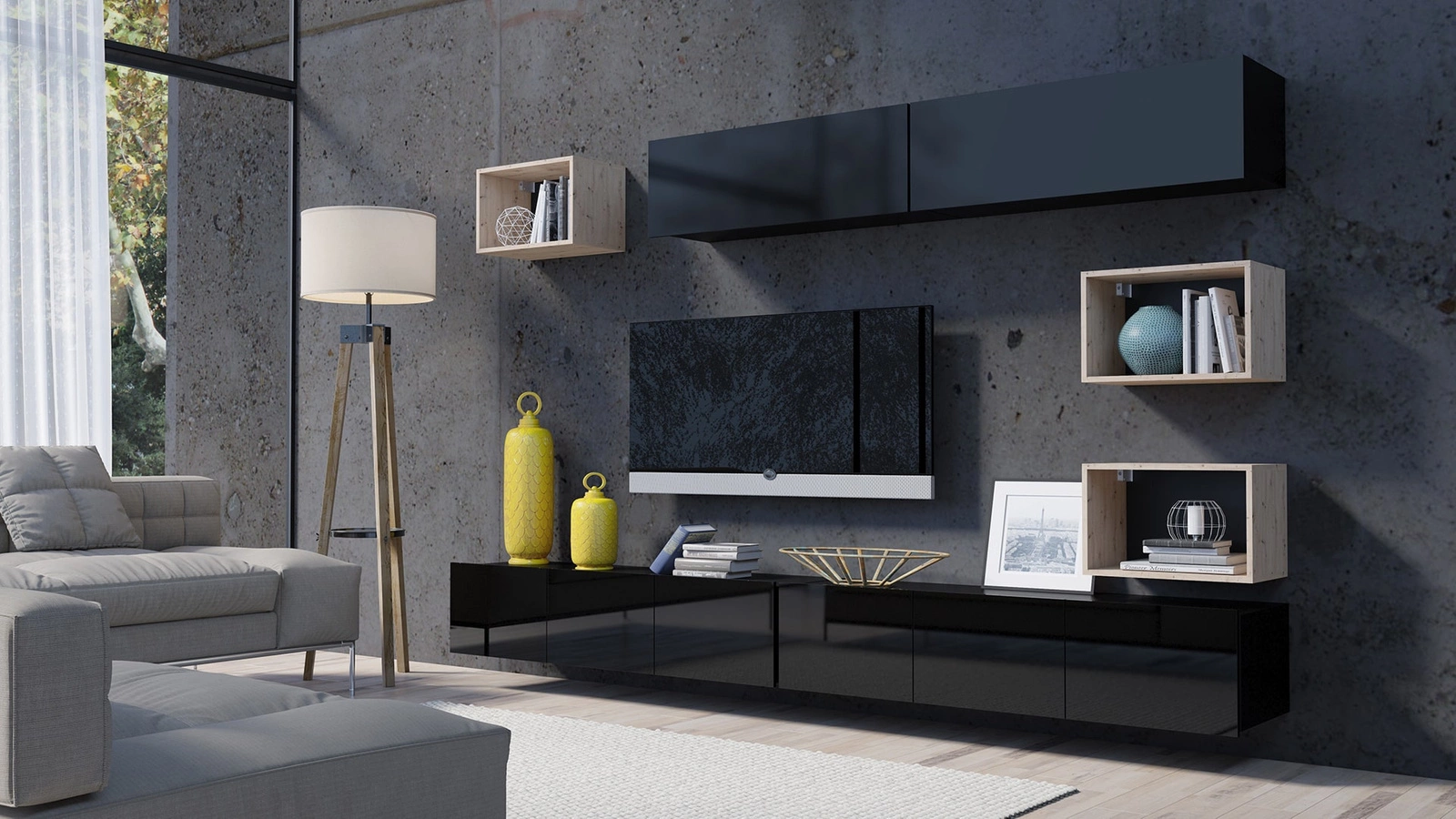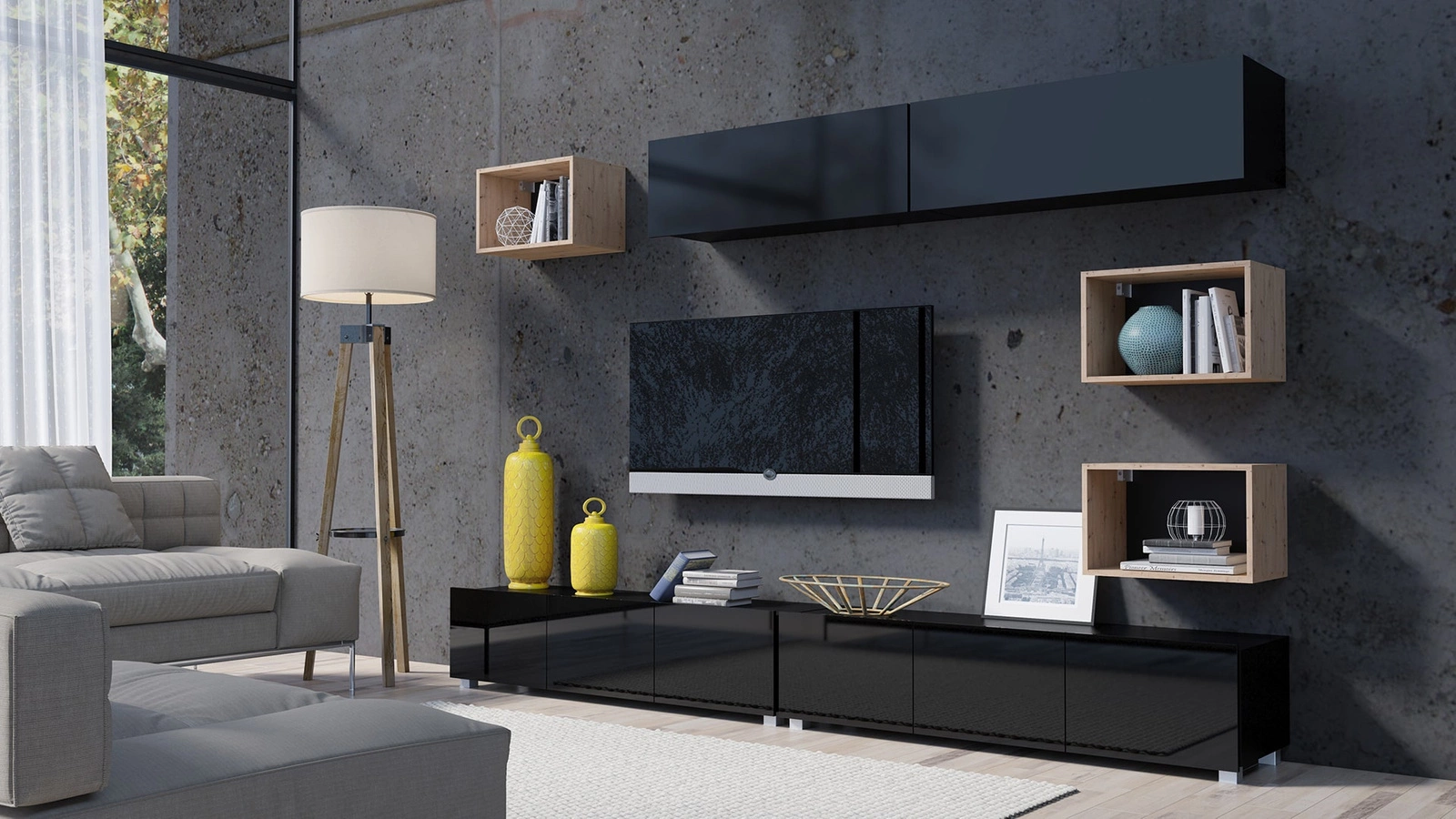 Meblościanka Apulia XXXI czarny połysk / dąb artisan wyjątkowo stylowa meblościanka proste bryły wpisujące się w każde wnętrze