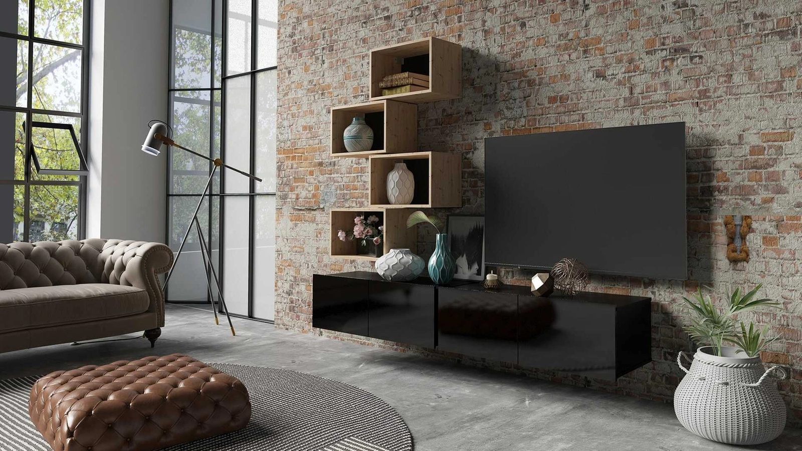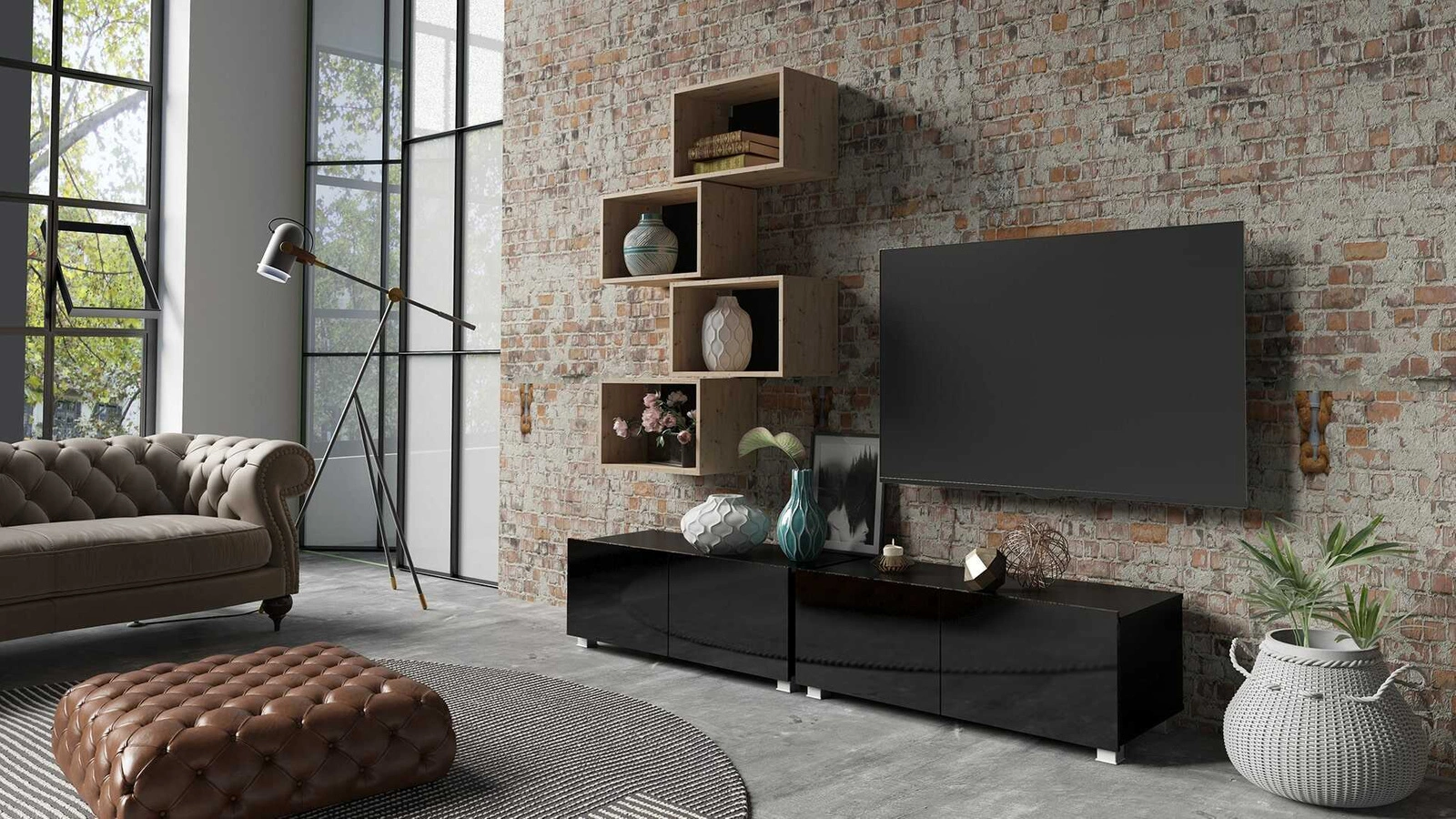 Meblościanka Apulia XXX czarny połysk / dąb artisan wyjątkowo stylowa meblościanka proste bryły wpisujące się w każde wnętrze