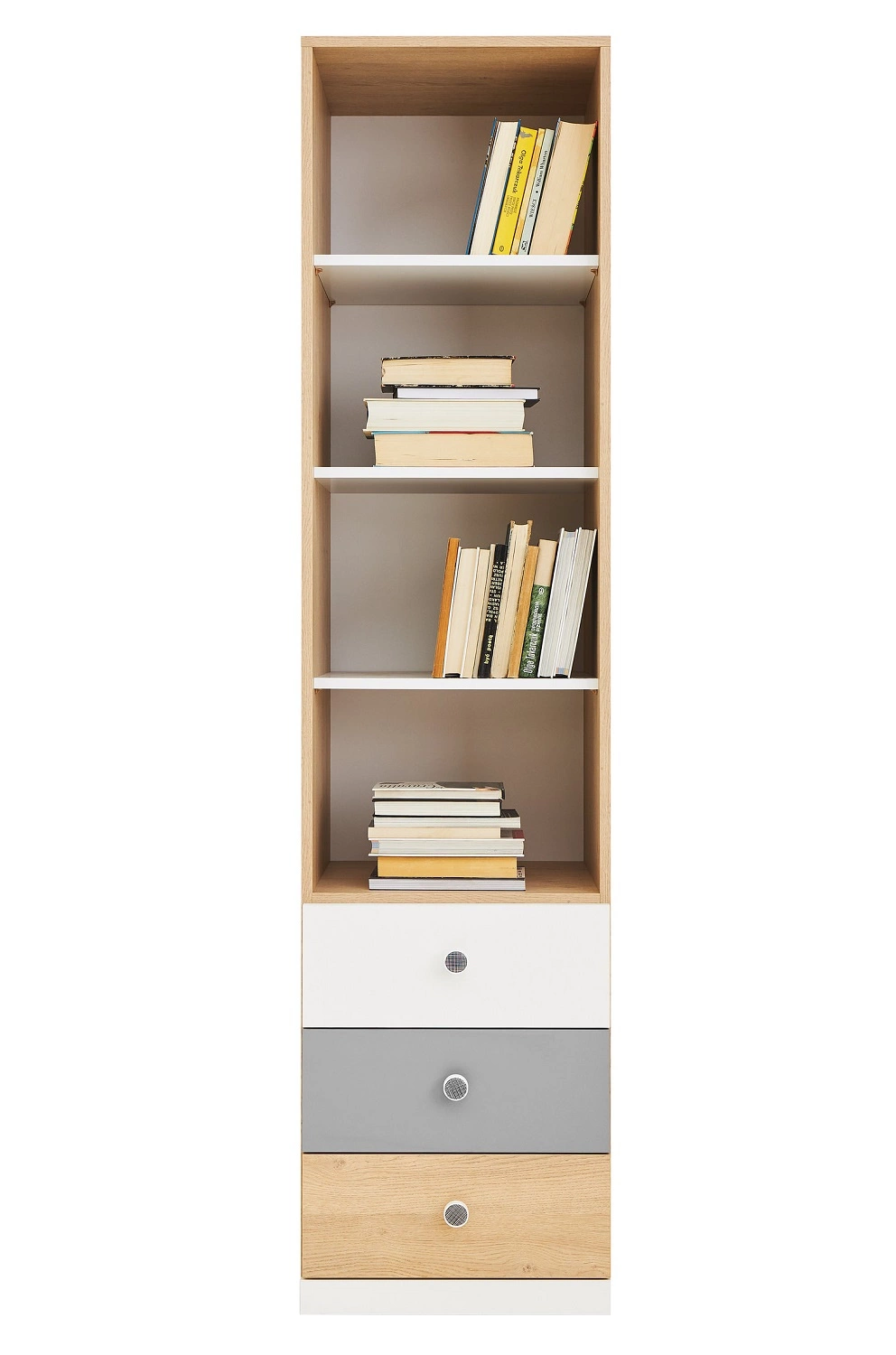 Regał Pixel w kolorze dąb biszkoptowy / biały / szary to przepis na nowoczesne oraz funkcjonalne wnętrze w pokoju nastolatka.