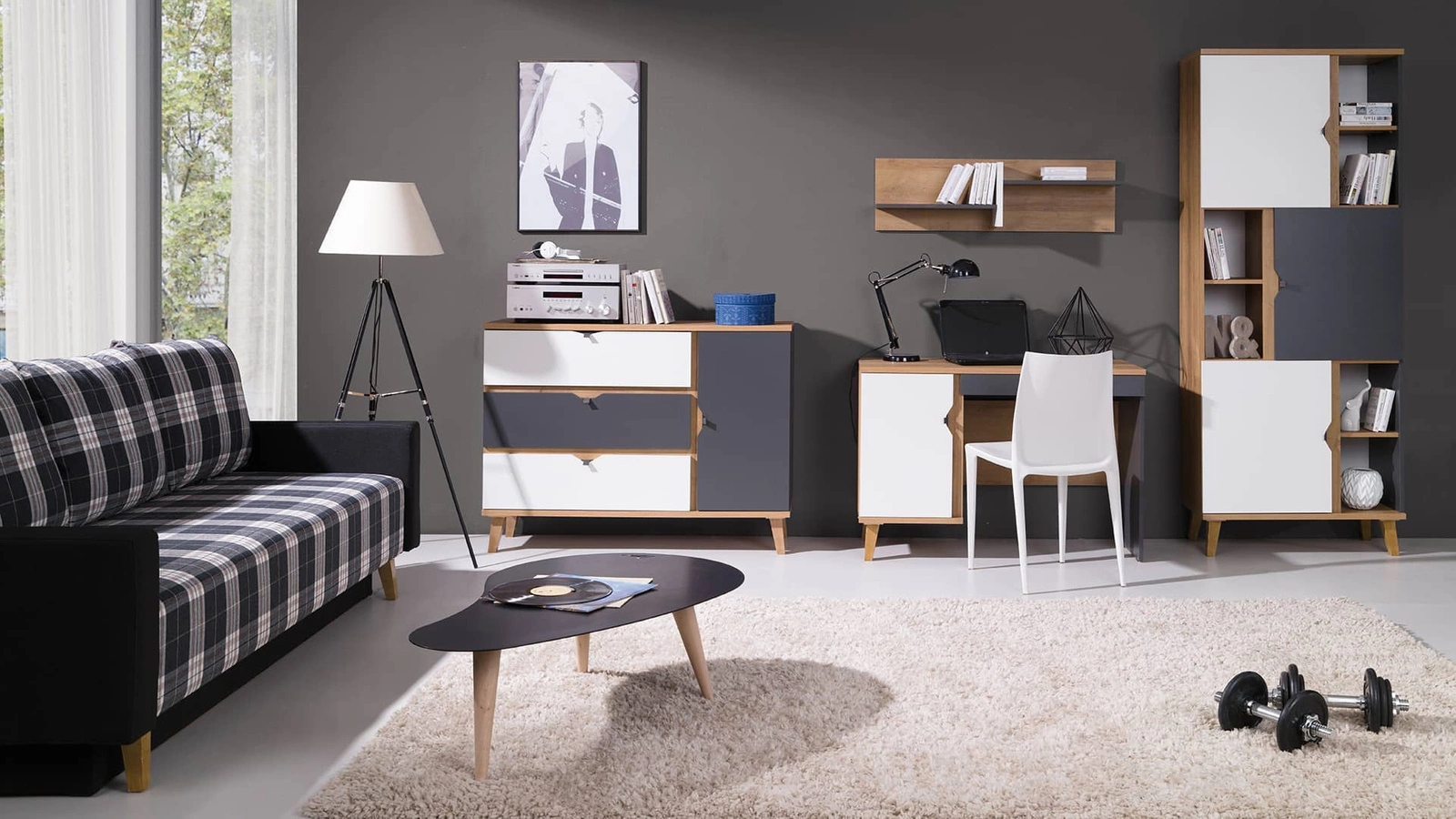 Komoda jest skonstruowana z 1 drzwi i 3 szuflad. Konstrukcja komody z szufladami została wsparta na nogach w stylu skandynawskim wykonanych z tworzywa sztucznego w dębowym dekorze. Komoda gwarantuje komfortowe i bezproblemowe korzystanie oraz trwałość całego mebla przez wiele lat użytkowania. Dębowe wybarwienie z kontrastującym grafitowym oraz bielą świetnie łączy się z innymi kolorami, dzięki czemu komoda z szufladami Memone świetnie sprawdzi się także w roli komody do pokoju dziennego lub komody do sypialni. Komoda z szufladami z powodzeniem odnajdzie się także jako mebel biurowy.