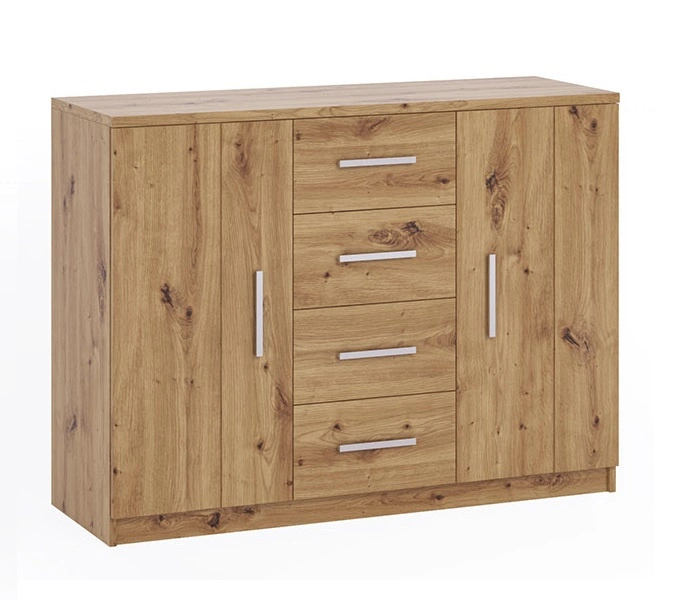 Komoda jest skonstruowana z 2 drzwi i 4 szuflad. Komoda gwarantuje komfortowe i bezproblemowe korzystanie oraz trwałość całego mebla przez wiele lat użytkowania. Klasyczny dębowy dekor świetnie łączy się z innymi kolorami, dzięki czemu komoda z szufladami Rico świetnie sprawdzi się w roli komody do salonu, komody do pokoju dziennego lub komody do sypialni. Komoda z szufladami z powodzeniem odnajdzie się także jako mebel biurowy.