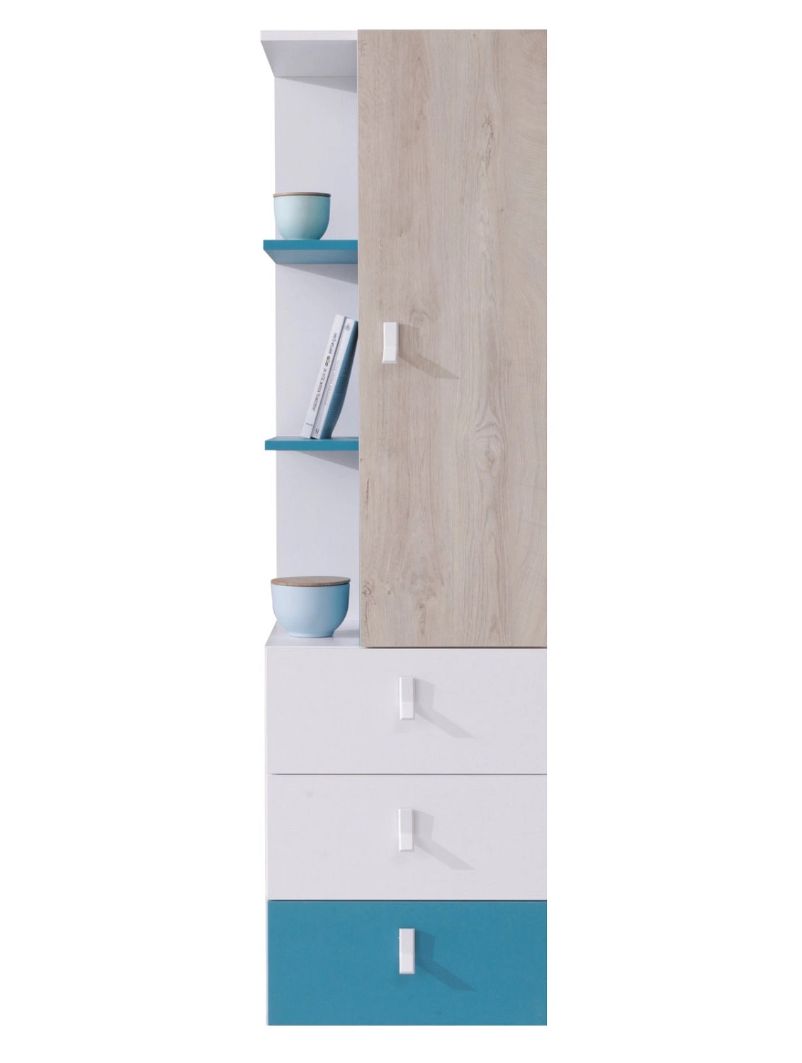 Zestaw mebli Niko w kolorze biały / dąb / morski to stylowe rozwiązanie, które idealnie wkomponuje się do każdego pokoju nastolatka lub pokoju dziecięcego.
