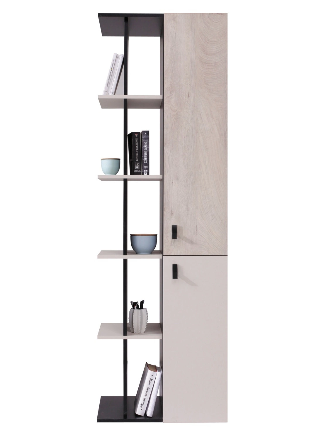 Regał Niko jest idealnym wyborem dla miłośników nowoczesnych, a także klasycznych aranżacji o eleganckim charakterze, dla których ważna jest również szeroka funkcjonalność mebla. Regał skonstruowany jest z 2 drzwi oraz części otwartej. Zamknięta część jest wyposażona w półki. Części otwarta z lewej strony, która skłąda się z półek, idealych na przechowywanie np. książek. Dopełnieniem frontów regału są subtelne uchwyty, które poza swoją podstawową funkcją nadają stylowego designu.