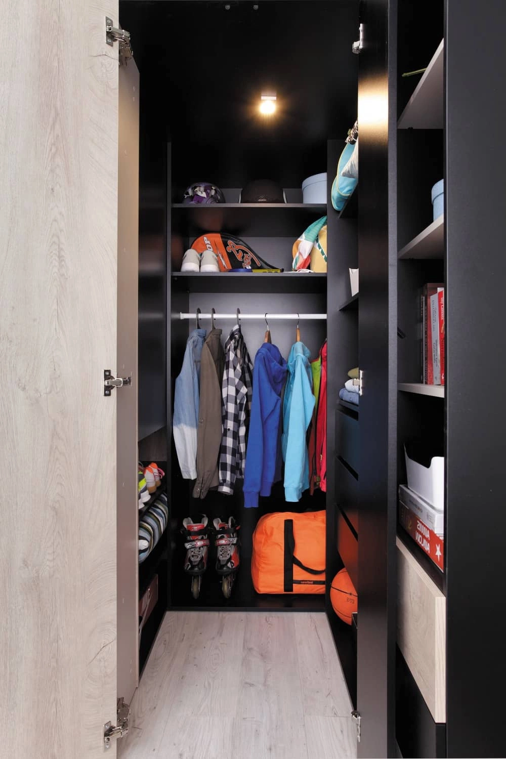 Standardowym wyposażeniem łóżka jest 1 szuflada oraz wysuwany panel z półkami. Pojemna szuflada to dodatkowe miejsce, które ułatwi utrzymanie porządku w pokoju. Jest świetnym miejscem na zabawki czy zapasową pościel. Dodatkowe regały to funkcjonalne meble, które ułatwią utrzymanie porządku w pokoju dziecięcym czy młodzieżowym. Szafa jest wyposażona w część z drążkiem na ubrania wiszące, część z półkami oraz szuflady.