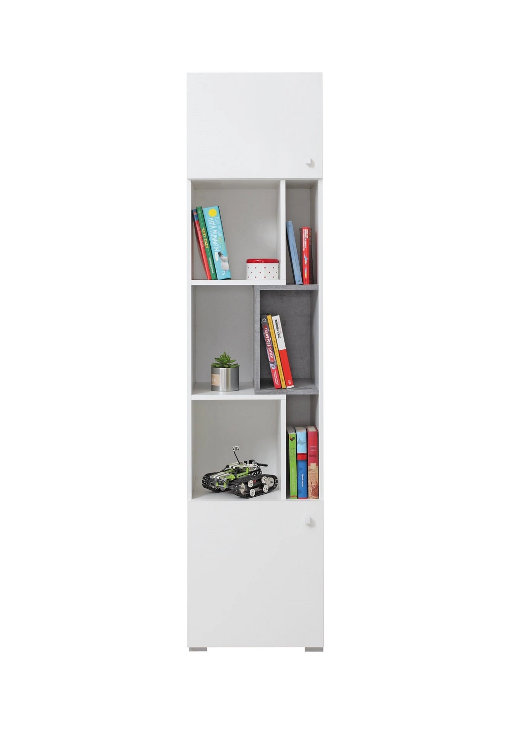 Regał Epsilon w kolorze biały / beton to przepis na nowoczesne oraz funkcjonalne wnętrze w pokoju nastolatka.