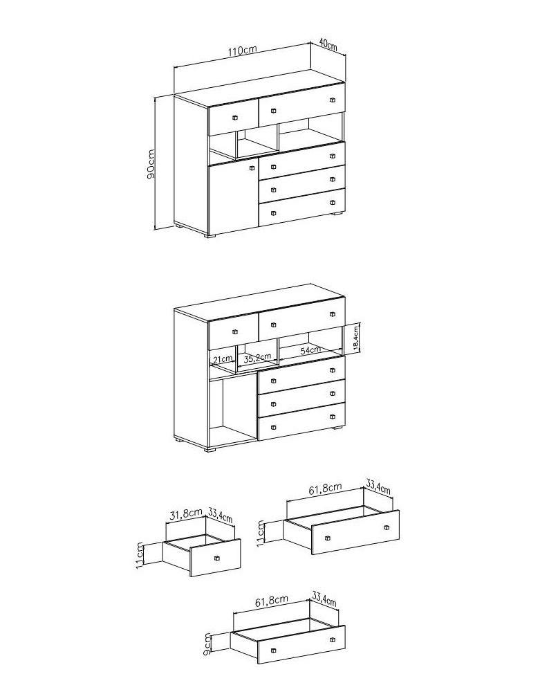 Szerokość 110 cm, wysokość 90 cm oraz głębokość 40 cm sprawiają, że komoda wpasuje się do każdego typu pomieszczenia! Komoda z szufladami gwarantuje komfortowe i bezproblemowe korzystanie oraz trwałość całego mebla przez wiele lat użytkowania.