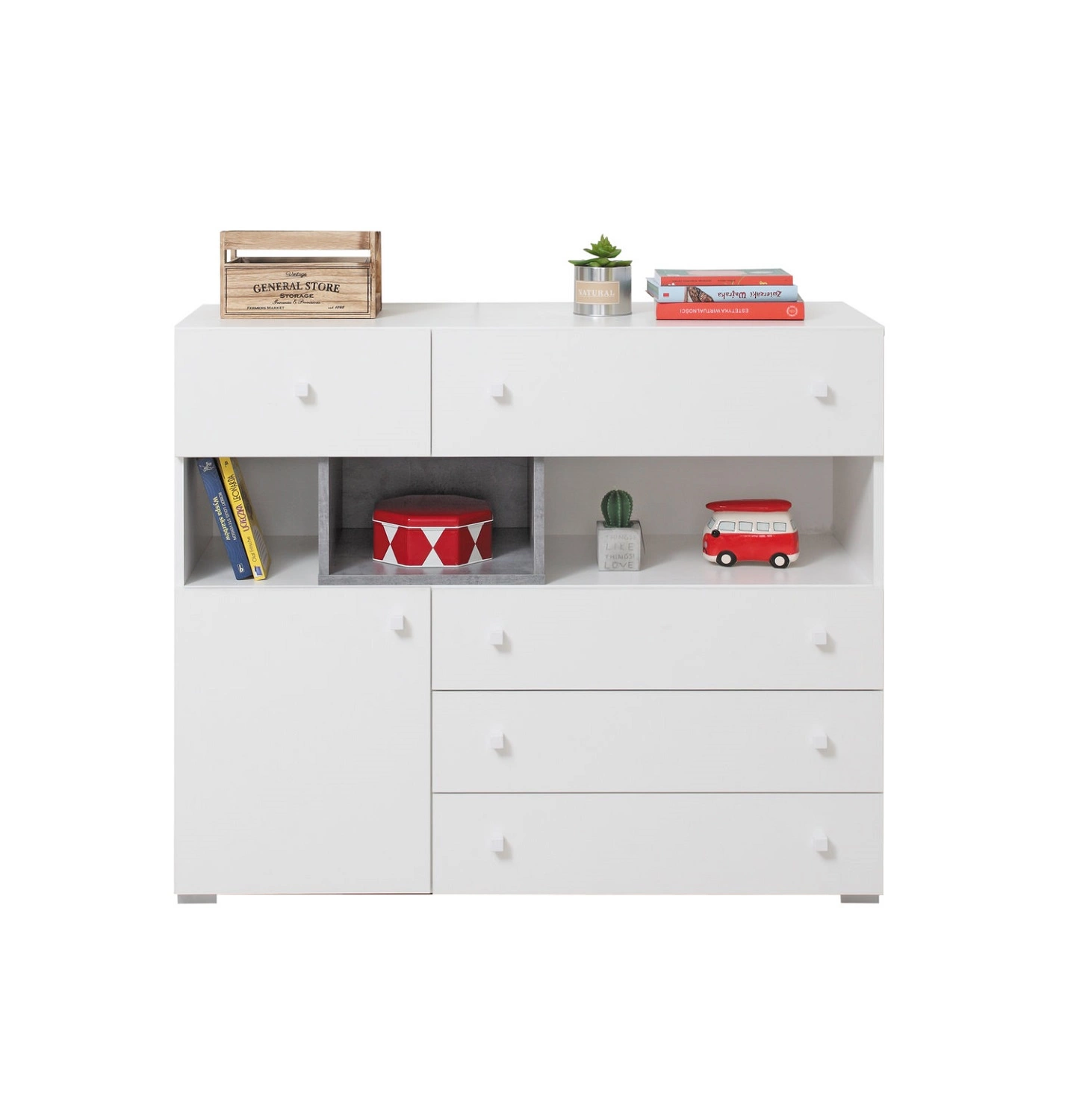Komoda z szufladami Epsilon 110 cm w kolorze biały / beton to przepis na nowoczesne oraz funkcjonalne wnętrze w Twoim domu!