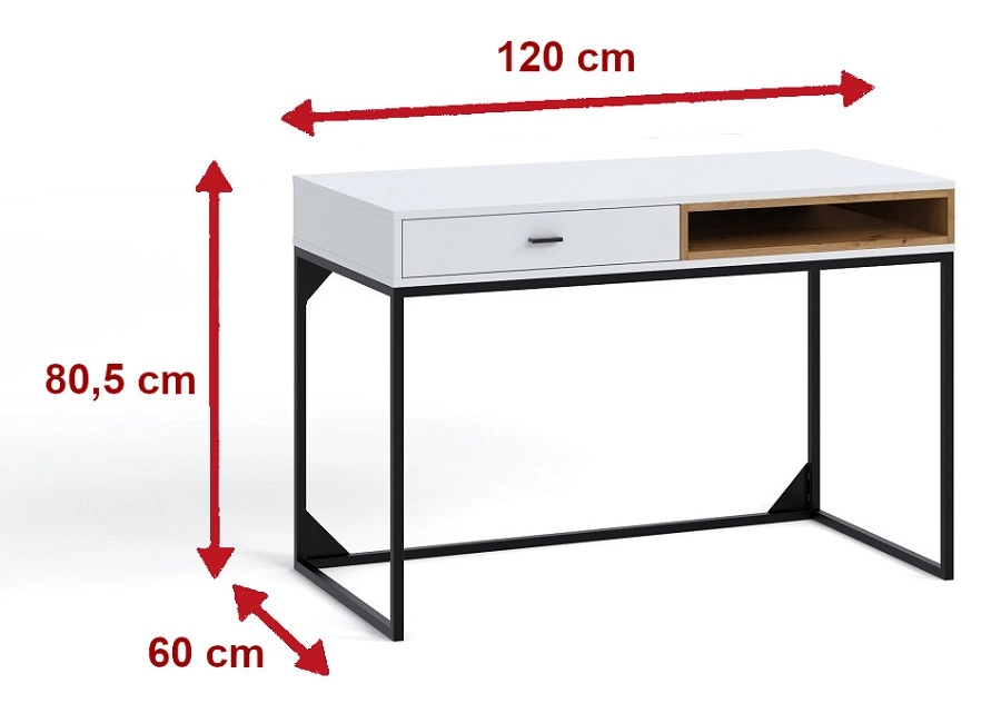 Biurko jest skonstruowane z blatu, otwartej półki oraz szuflady wyposażonej w prowadnice z systemem cichego domykania. Zastosowany system zwiększy komfort i bezpieczeństwo użytkowania mebli. Biurka loftowe wykonane zostały z wysokiej jakości płyty laminowanej o grubości 16mm, która charakteryzuje się odpornością na wpływ czynników zewnętrznych takich jak obicia, uderzenia i niefortunne zadrapania.