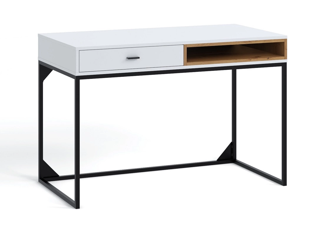 Biurko Olier powstało z myślą o modnych i nowoczesnych wnętrzach. Prosta bryła w kolorze białym umieszczona na czarnych, metalowych stelażach gwarantuje dużą stabilność oraz nadaje designerski, loftowy charakter. Minimalistyczny uchwyt oraz wstawka w kolorze dąb artisan to elementy, które przyciągają wzrok i sprawiają, że całość prezentuje się bardzo gustownie.
