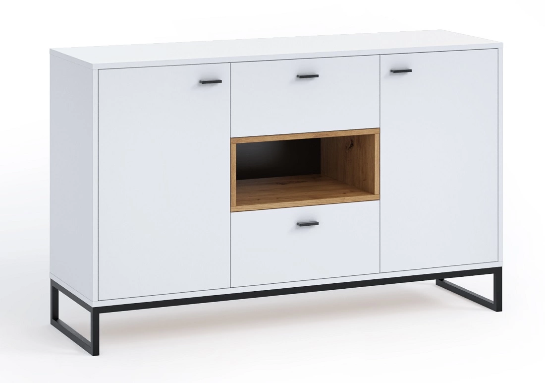 Komoda z szufladami Olier powstała z myślą o modnych i nowoczesnych wnętrzach. Prosta bryła w kolorze białym umieszczona na czarnych, metalowych stelażach gwarantuje dużą stabilność oraz nadaje designerski, loftowy charakter. Minimalistyczne uchwyty oraz wstawki w kolorze dąb artisan to elementy, które przyciągają wzrok i sprawiają, że całość prezentuje się bardzo gustownie.