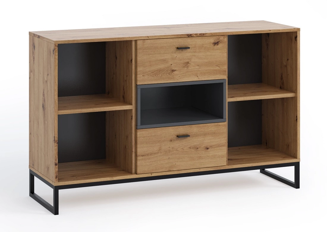 Loftowy styl idealnie koresponduje z aktualnymi trendami wnętrzarskimi dzięki czemu meble z kolekcji Olier łatwo zaaranżować w salonie, sypialni lub w gabinecie. Pojemne szuflady oraz zamykane szafki pomieszczą wszystkie rzeczy oraz niezbędne akcesoria. Komoda gwarantuje komfortowe i bezproblemowe korzystanie oraz trwałość całego mebla przez wiele lat użytkowania.