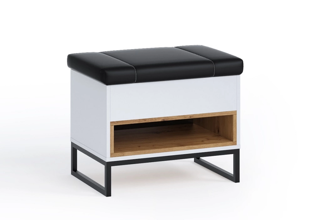 Szafka na buty z siedziskiem Olier powstała z myślą o modnych i nowoczesnych wnętrzach. Prosta bryła w kolorze białym umieszczona na czarnych, metalowych stelażach gwarantuje dużą stabilność oraz nadaje designerski, loftowy charakter. Otwarta półka w kolorze dąb artisan to element, który przyciąga wzrok i sprawia, że całość prezentuje się bardzo gustownie. Tapicerowane siedzisko obite ekoskórą nadaje funkcjonalności oraz nieco oryginalności.
