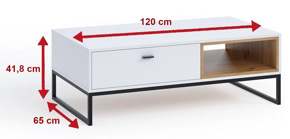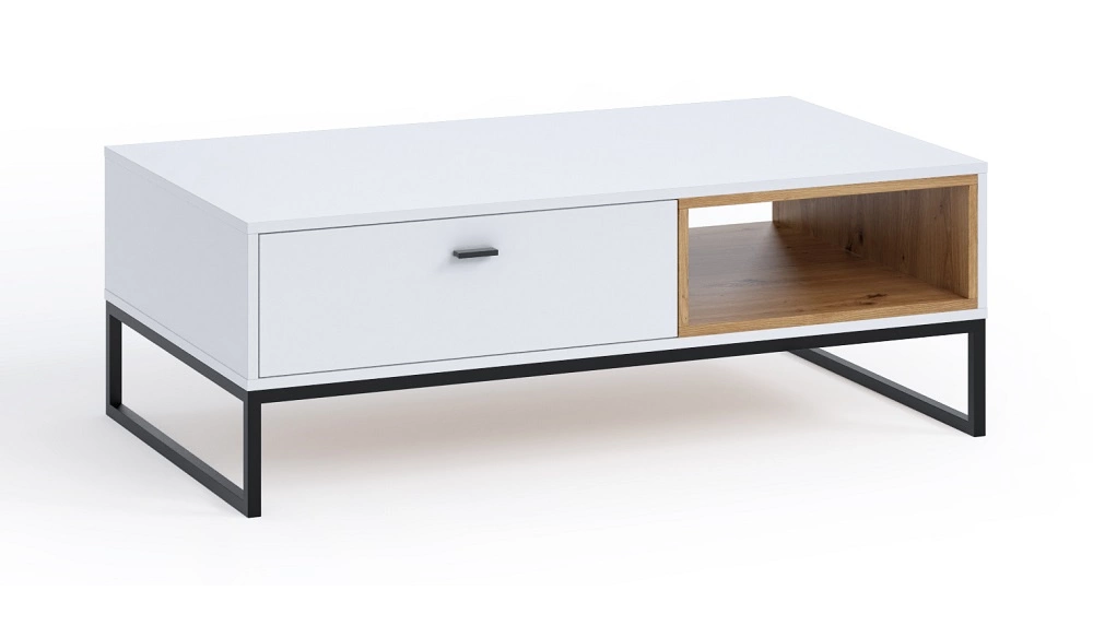 Stolik kawowy Olier powstał z myślą o modnych i nowoczesnych wnętrzach. Prosta bryła w kolorze białym umieszczona na czarnych, metalowych stelażach gwarantuje dużą stabilność oraz nadaje designerski, loftowy charakter. Minimalistyczne uchwyty oraz wstawki w kolorze dąb artisan to elementy, które przyciągają wzrok i sprawiają, że całość prezentuje się bardzo gustownie.