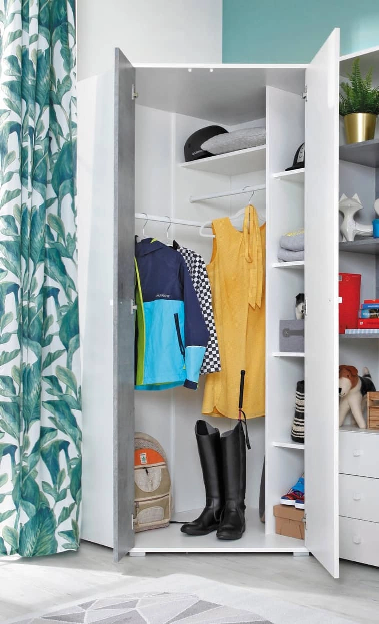 Zestaw mebli Epsilon w kolorze biały / beton to stylowe rozwiązanie, które idealnie wkomponuje się do każdego pokoju nastolatka lub pokoju dziecięcego.