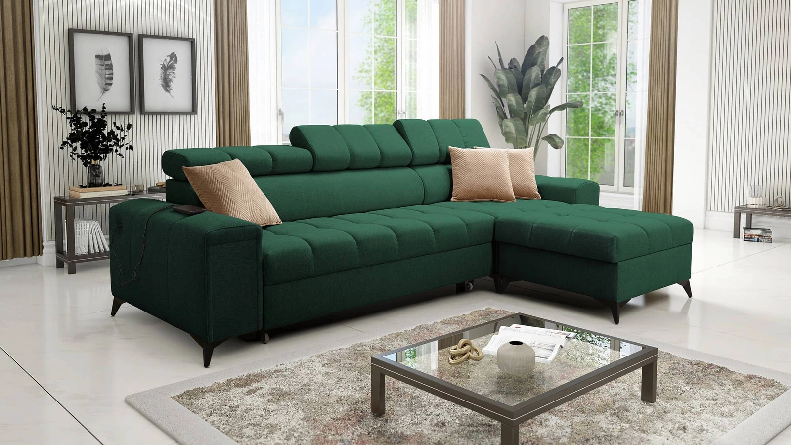 Narożnik Bolmso w kolorze zielonym z regulowanymi zagłówkami to zachwycający mebel z gwarancją najwyższego komfortu i funkcjonalności.