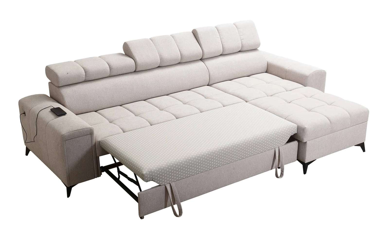 Dodatki tego mebla, które docenią wszyscy użytkownicy to dwa pojemniki na pościel, funkcja spania, gniazdo ładowania USB w boczku narożnika oraz szuflada z systemem pełnego wysuwu w boczku mebla.