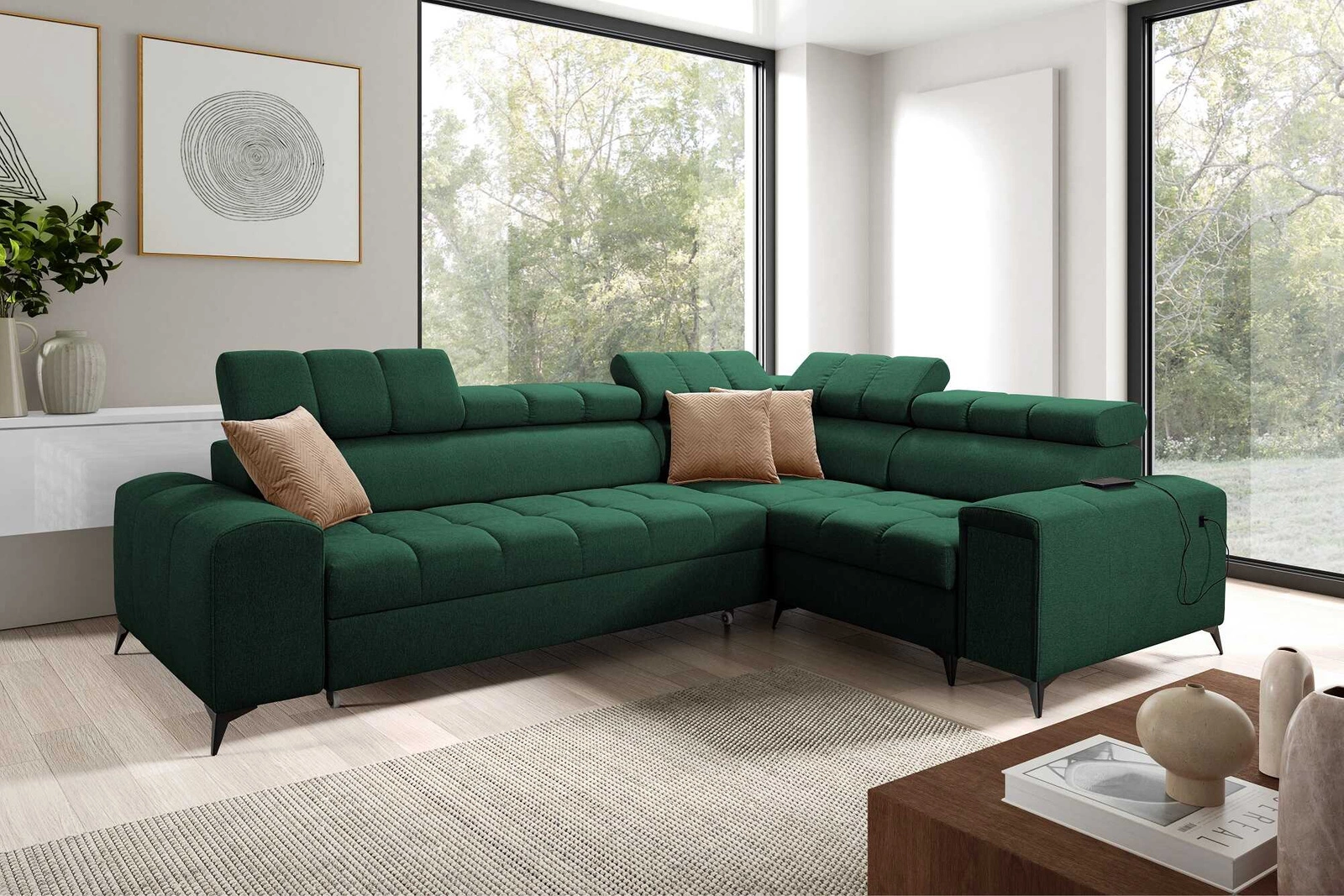 Narożnik Bolmso II w kolorze zielonym z regulowanymi zagłówkami to zachwycający mebel z gwarancją najwyższego komfortu i funkcjonalności.