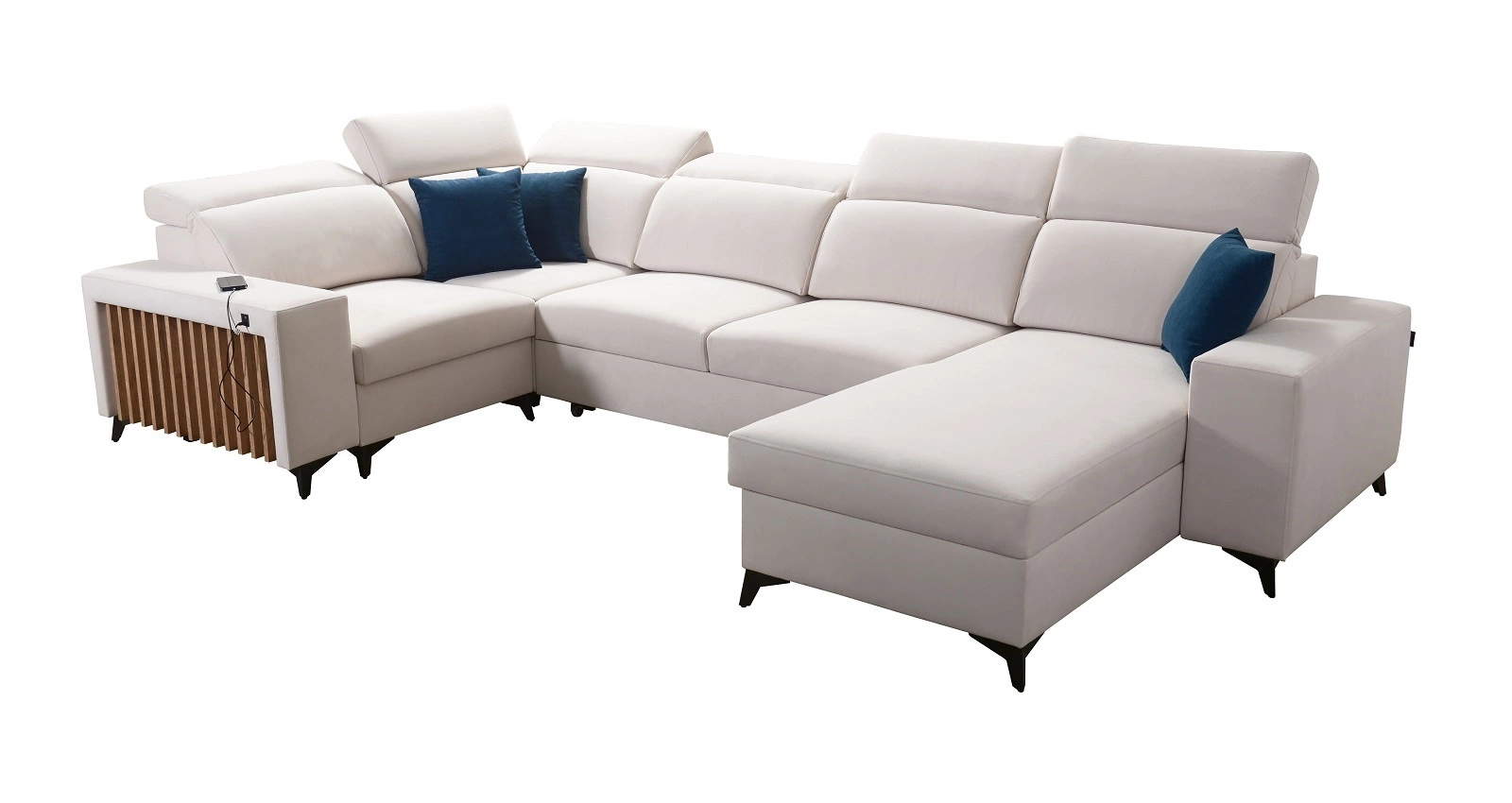 Dodatki tego mebla, które docenią wszyscy użytkownicy to dwa pojemniki na pościel, funkcja spania, gniazdo ładowania USB w boczku narożnika do ładowania telefonu i innych urządzeń multimedialnych.