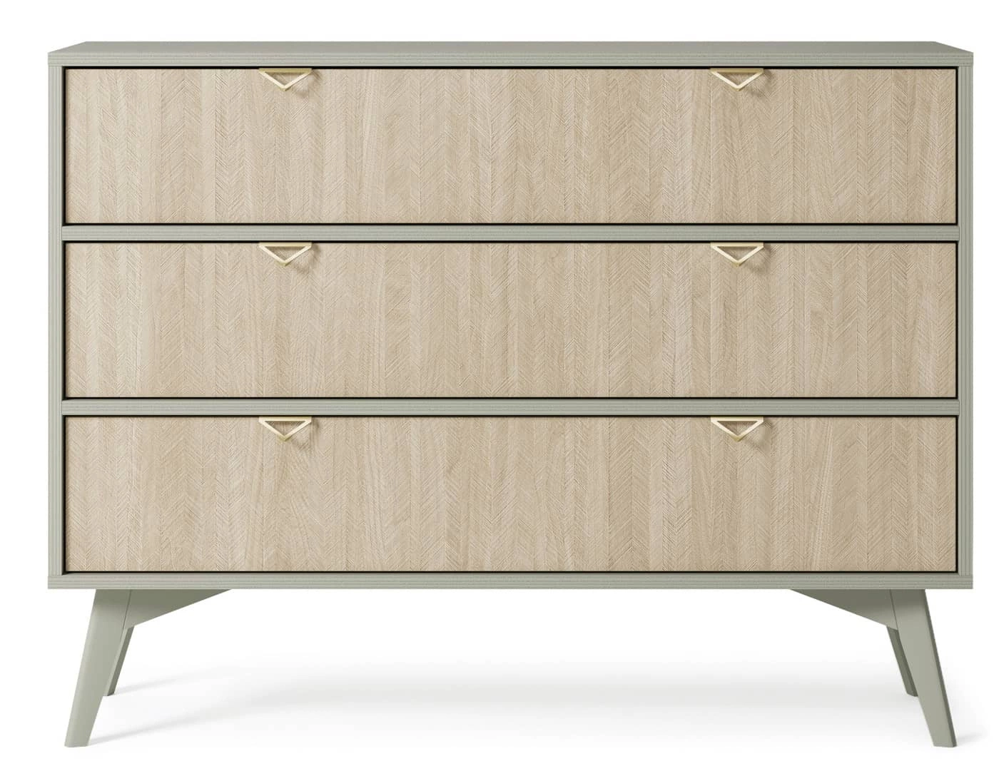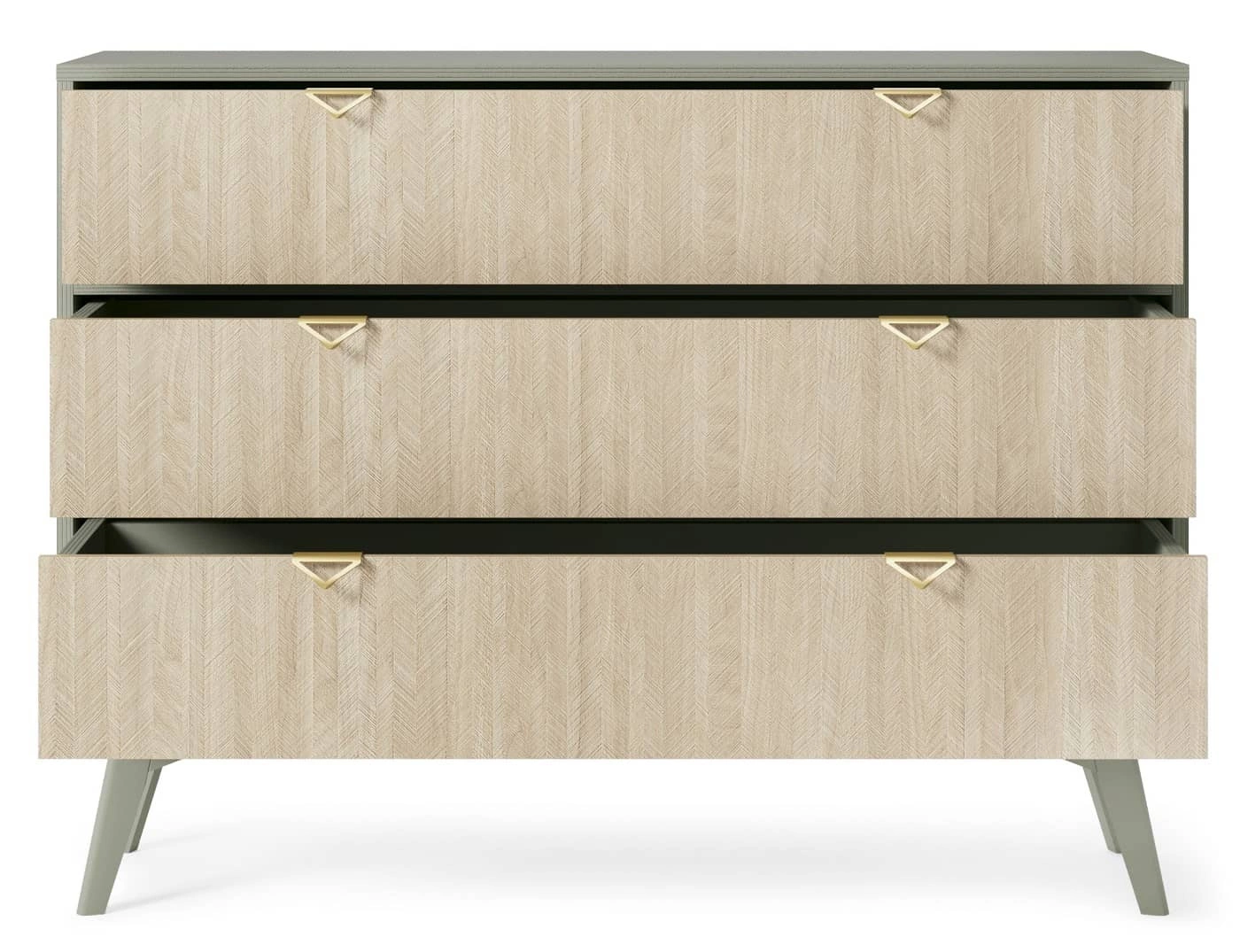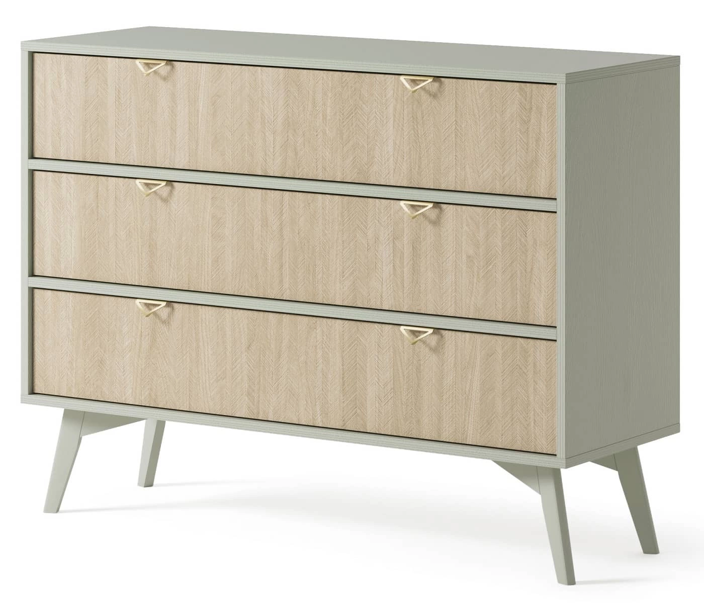 Komoda z szufladami 106 cm Wald w kolorze eukaliptus / beż jodełka to oryginalny mebel, który idealnie wkomponuje się w każdą aranżację.