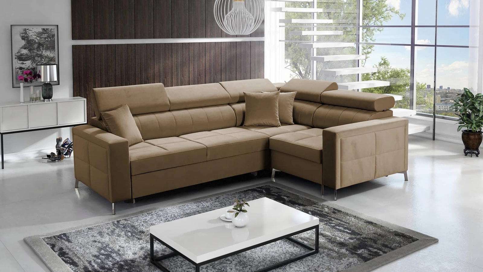 Narożnik Nausa II w kolorze jasny brąz z regulowanymi zagłówkami to elegancki mebel, który dopasuje sie do każdej aranżacji.