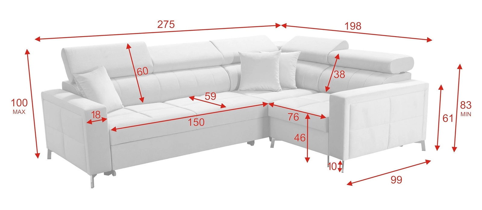 Wymiary mebla są optymalne. Szerokość narożnika 275 cm, wysokość maksymalna 100 cm oraz głębokość 198 cm. Powierzchnia spania narożnika wynosi 127x210 cm. Wysokość siedziska mebla to 46 cm a maksymalna wysokość oparcia wynosi 60 cm. Sprężyny faliste oraz pianka poliuretanowa T30 to materiał, z którego wykonane zostało siedzisko narożnika. Oparcie stałe z regulowanymi zagłówkami daje gwarancję wygodnego wypoczynku po długim dniu, które docenisz Ty, Twoi bliscy a także goście, którzy zasiądą na tym wyjątkowym narożniku!