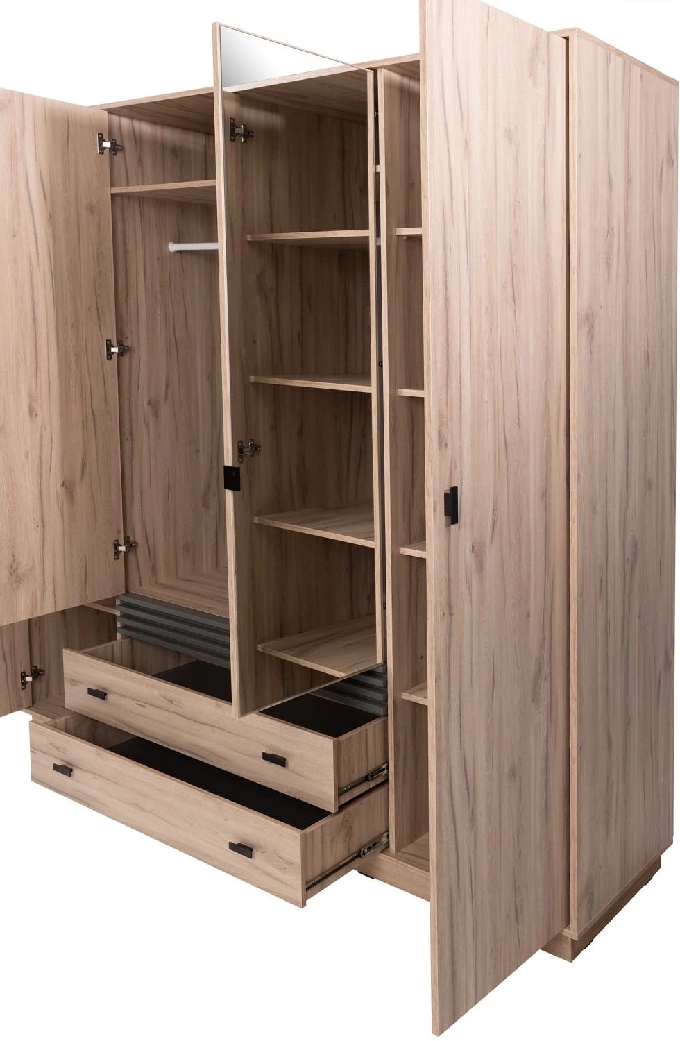 Szafa Estan jest idealnym wyborem dla miłośników nowoczesnych aranżacji o eleganckim charakterze, dla których ważna jest również szeroka funkcjonalność mebla. Mebel skonstruowany jest z 4 drzwi oraz 3 szuflad wysuwanych na prowadnicach kulkowych. Szafa Estan dzieli się na część z drążkiem i część z półkami. Fronty w kolorze dąb estana jasny zostały przełamane wstawkami w kolorze antracytu. Środkowe drzwi są wykończone dużym lustrem. Stylowym dopełnieniem frontów szafy są metalowe uchwyty w kolorze czarnym, które poza swoją podstawową funkcją, nadają meblom szczególnego charakteru.