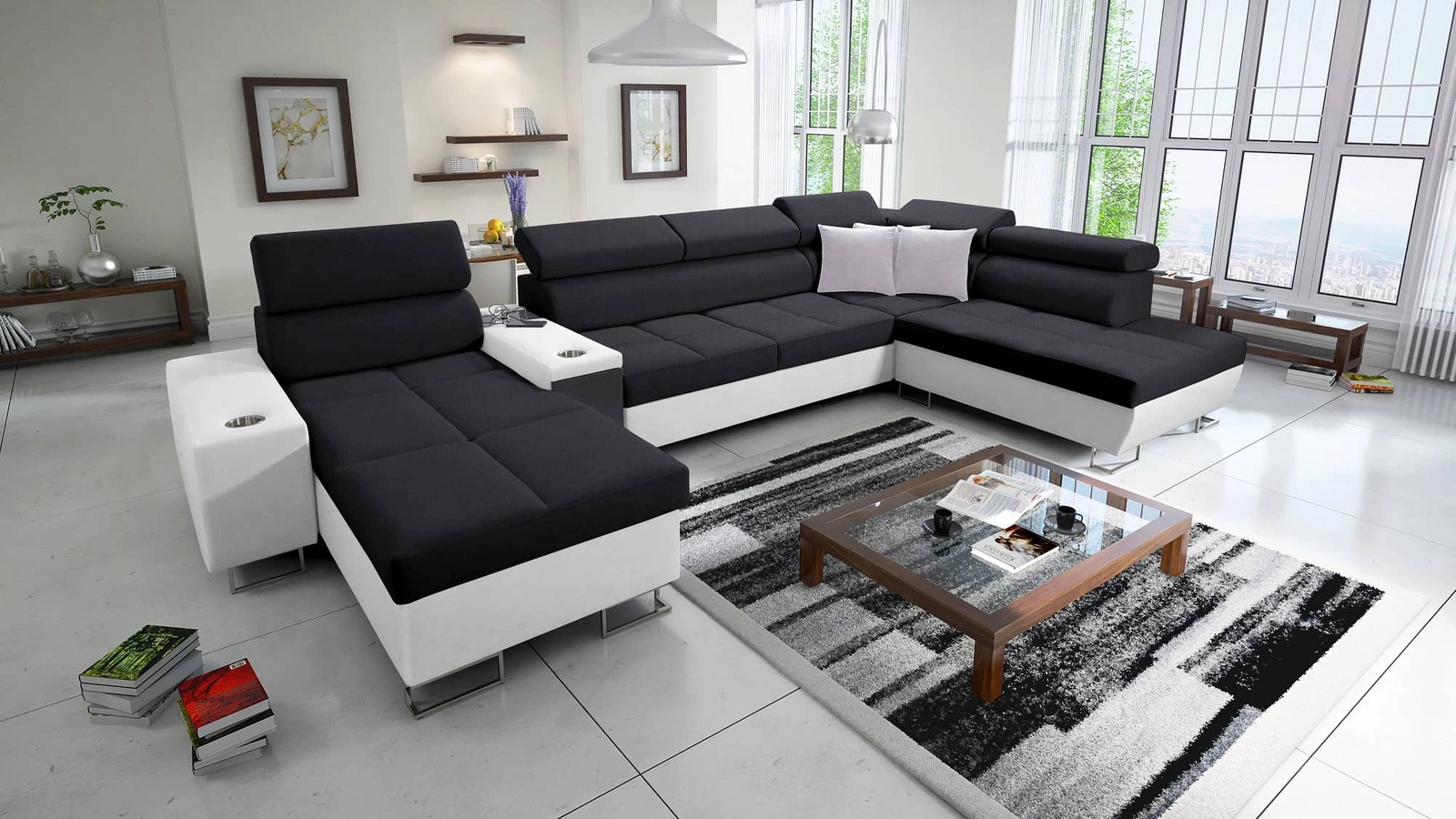 Narożnik Dafni V w kolorze czarny / biały z regulowanymi zagłówkami to ciekawie prezentujący się mebel z gwarancją najwyższego komfortu i funkcjonalności.