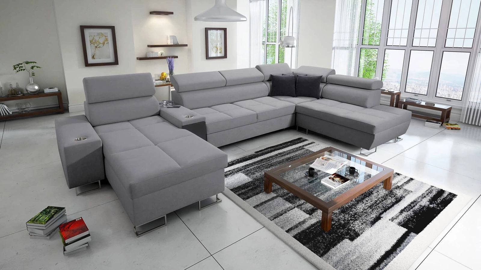 Dodatki tego mebla, które docenią wszyscy użytkownicy to dwa pojemniki na pościel, funkcja spania, uchwyty na kubki w boczkach, gniazdo ładowania USB i gniazdo elektryczne w boczku narożnika oraz szuflada z systemem pełnego wysuwu w boczku mebla.