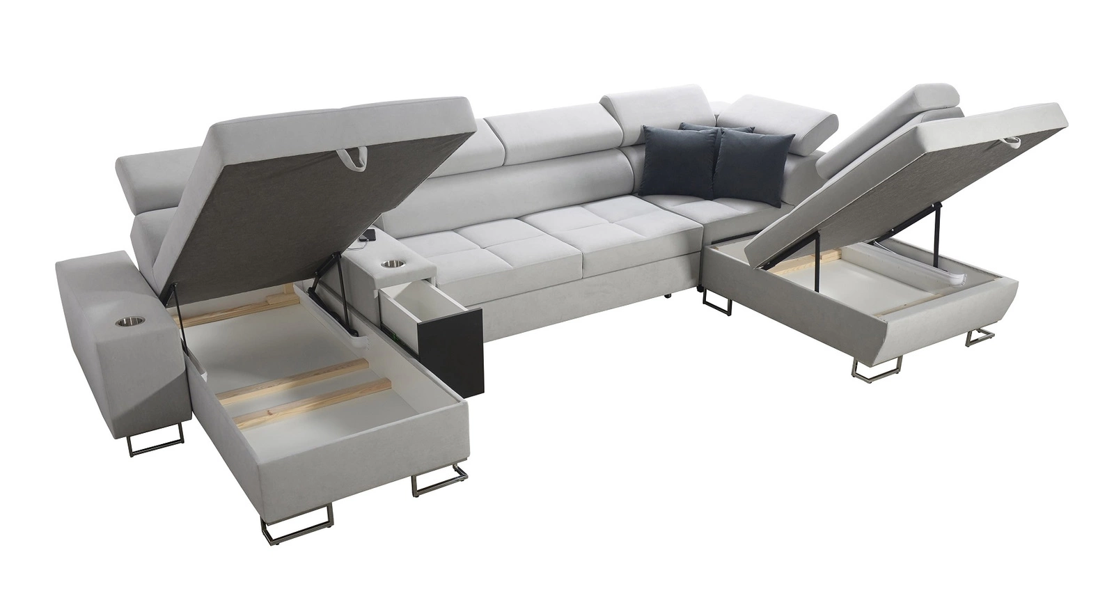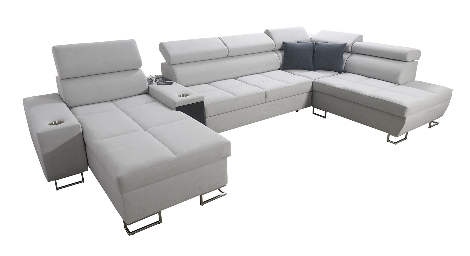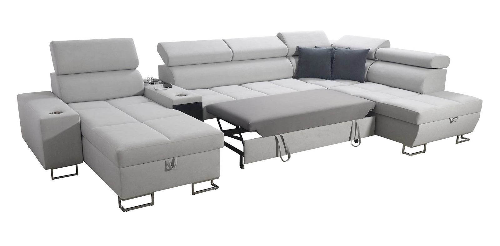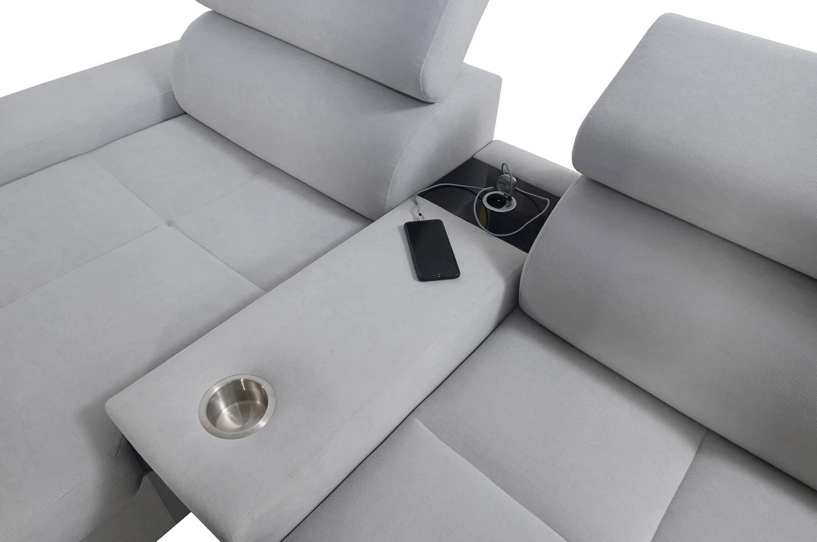Dodatki tego mebla, które docenią wszyscy użytkownicy to dwa pojemniki na pościel, funkcja spania, uchwyty na kubki w boczkach, gniazdo ładowania USB i gniazdo elektryczne w boczku narożnika oraz szuflada z systemem pełnego wysuwu w boczku mebla.
