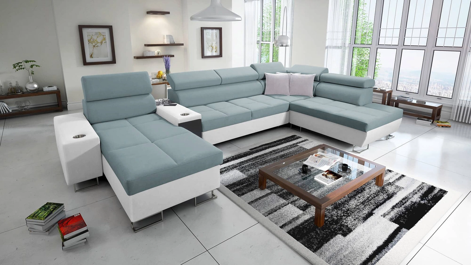 Narożnik Dafni V w kolorze arktyczny błękit / biały z regulowanymi zagłówkami to ciekawie prezentujący się mebel z gwarancją najwyższego komfortu i funkcjonalności.